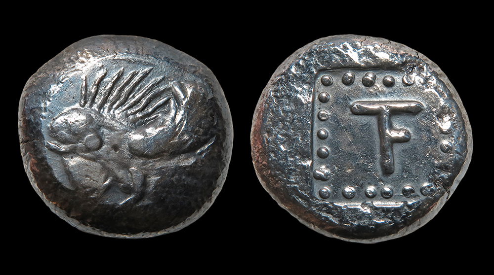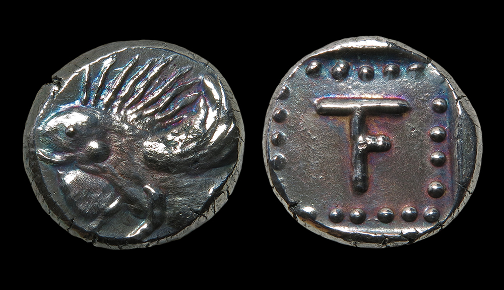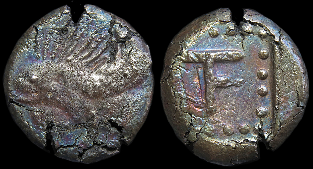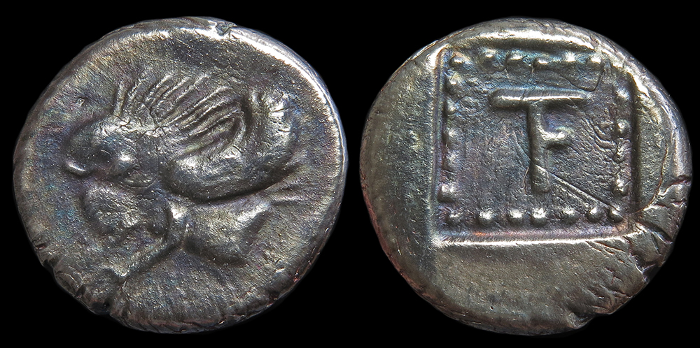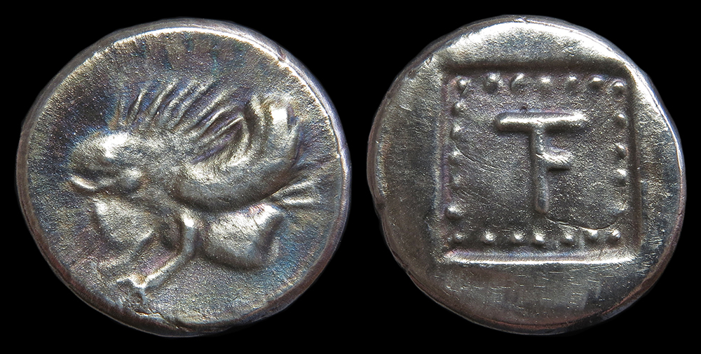 My carving skills aren't the greatest and I don't have (or know how to use) CAD software yet. Dragons and griffins might be a bit challenging but eventually I'll give them a try. ... I guess this is as good a place as any to introduce the following coins. I had planned to wait until the archaeology team had uncovered more specimens. These are the first known coins from ancient Tiffily, a small now-submerged ancient island nation somewhere off the west coast of Anatolia. The exact location is being withheld to prevent opportunists from disturbing the historic site. Dive teams are methodically excavating the city. In addition to coins and the usual remains of ancient civilizations, engraved tablets have also been found and archaeologists are currently working on transcriptions. Apparently, these tablets record the history of Tiffily, including myths and religious beliefs. To date, several coins have been found at the underwater dig site. All have the same iconography: a winged iguana which the researchers have dubbed "Iguanasus". Hopefully, translation of the texts will reveal more details about this mysterious creature and Tiphonian culture. TIFFILY, Tiphonia c. 5th century BCE AR18, 7.4 gm, and AR 17, 7.4 gm Obv: Forepart of winged iguana left Rev: Monogram within dotted square, incuse Ref: SNG Tiffily 1 and 2, respectively This, and one other of similar size and weight, are puzzling. Metallurgic analysis shows them to be 99.9% silver yet they are somewhat porous. Perhaps the copper leached out over the centuries. These three coins are thought to be older than the rest. However, the dies are quite similar. Current thinking is that coins 1-3 were cast rather than struck. TIFFILY, Tiphonia c. 5th century BCE AR 16, 6.0 gm Obv: Forepart of winged iguana left Rev: Monogram within dotted square, incuse Ref: SNG Tiffily 4 This coin is missing from the research lab and it is feared that an unscrupulous member of the archaeology team has sold it on the black market. TIFFILY, Tiphonia c. 5th century BCE AR 16, 7.5 gm Obv: Forepart of winged iguana left Rev: Monogram within dotted square, incuse Ref: SNG Tiffily 5 Most of the coins, including this one, are of terrible workmanship. One would think that these mint workers had no idea what they were doing. Clearly there was no quality control. TIFFILY, Tiphonia c. 5th century BCE AR tetradrachm (Rhodian standard), 15 gm Obv: Forepart of winged iguana left Rev: Monogram within dotted square, incuse Ref: SNG Tiffily 10 This coin is also missing and feared sold. Metallurgic analysis reveals that all Tiphonian coins found so far are an alloy of 90% silver and 10% copper, except for SNG Tiffily 1-3, which are 99.9% silver.