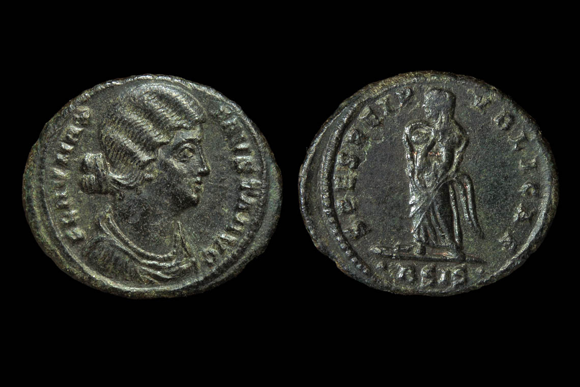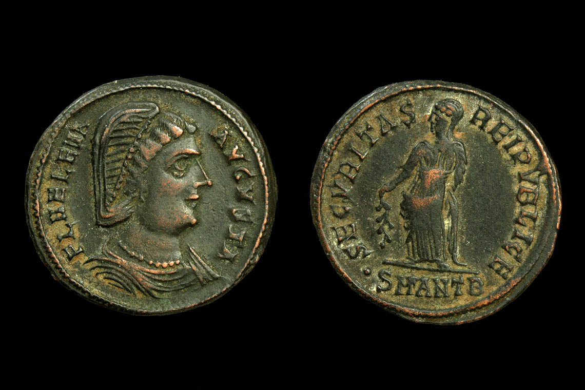 Helena carries no children. Fausta carries two. Theodora has one on the viewers' right and looks that direction. I'll go Theodora.