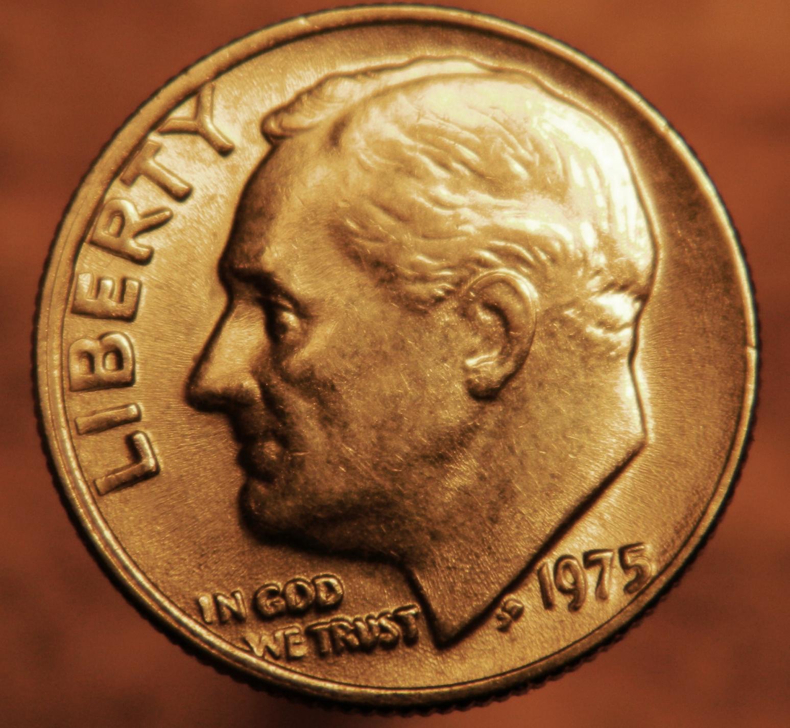 It has a past life as a Mercury dime. The date isn't ddo it's a date over a date. On the obverse you can clearly see the hatchet. The color of the dime well seems much older than 1975 and it does seem to have an off color to it. But very well could be 90 percent silver and 10 percent copper if I am correct and it is a Mercury dime.