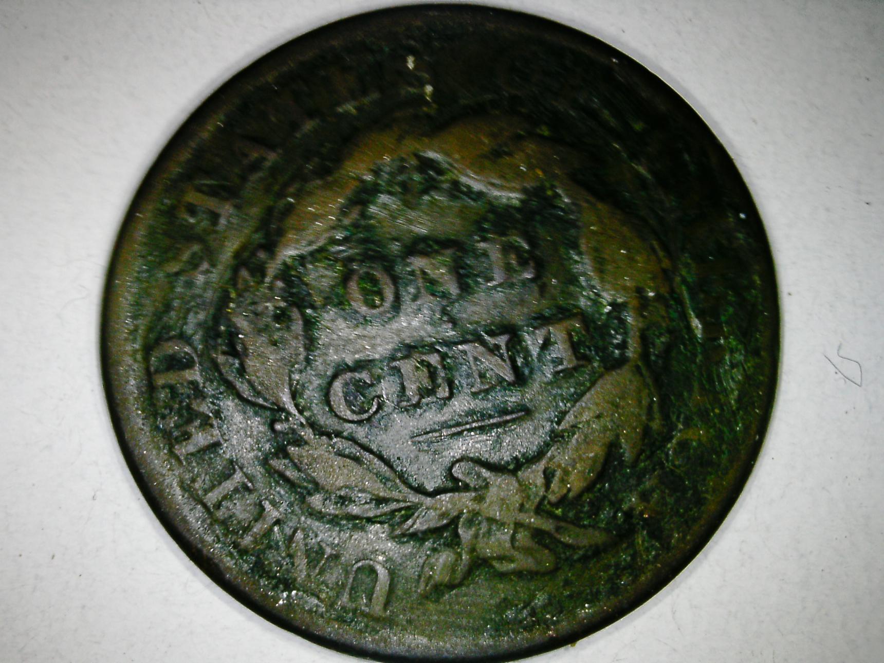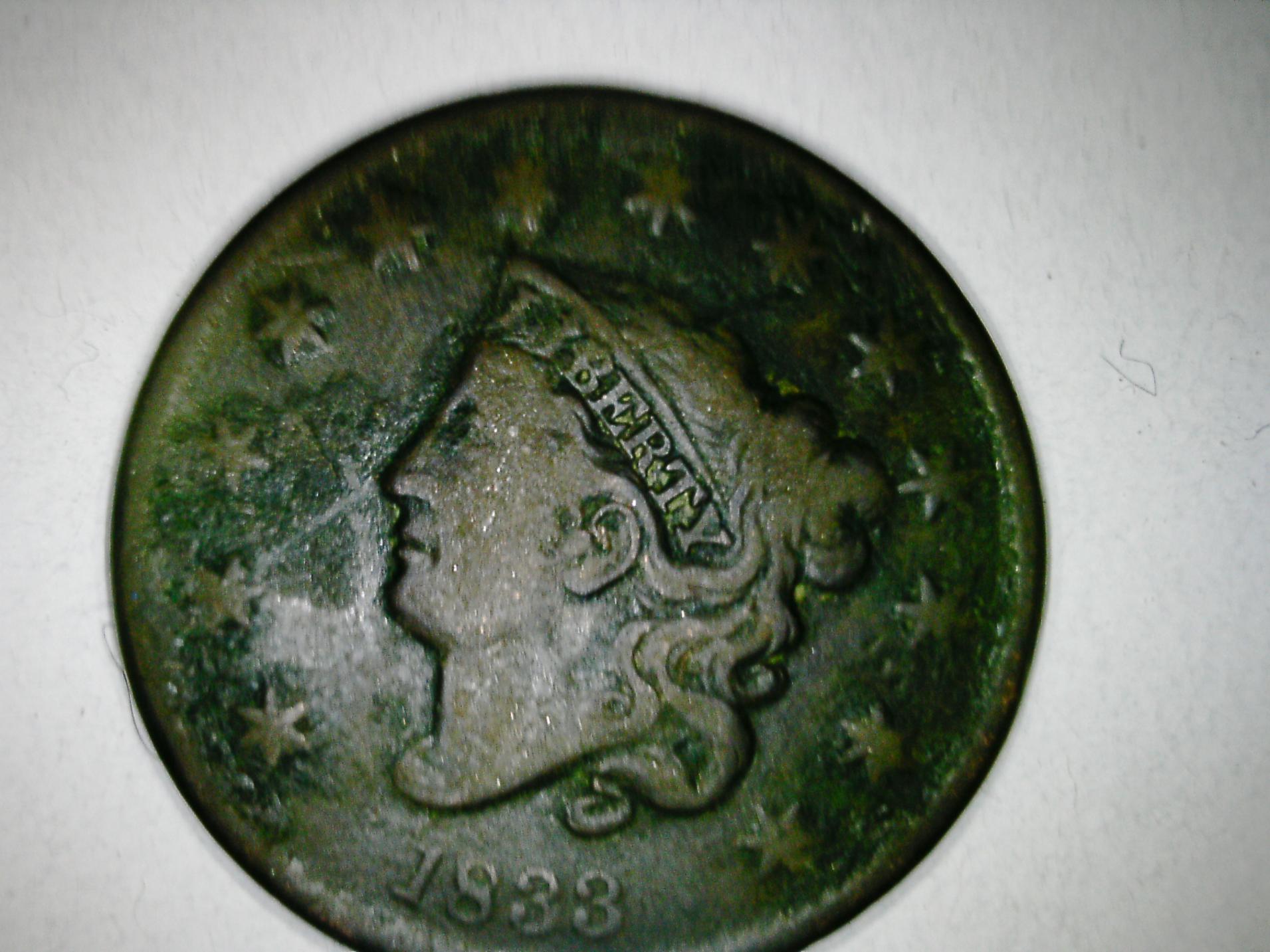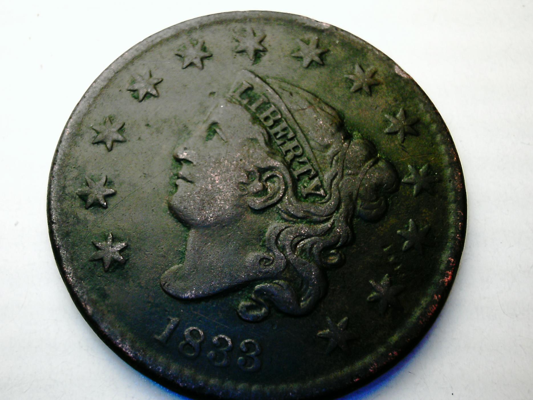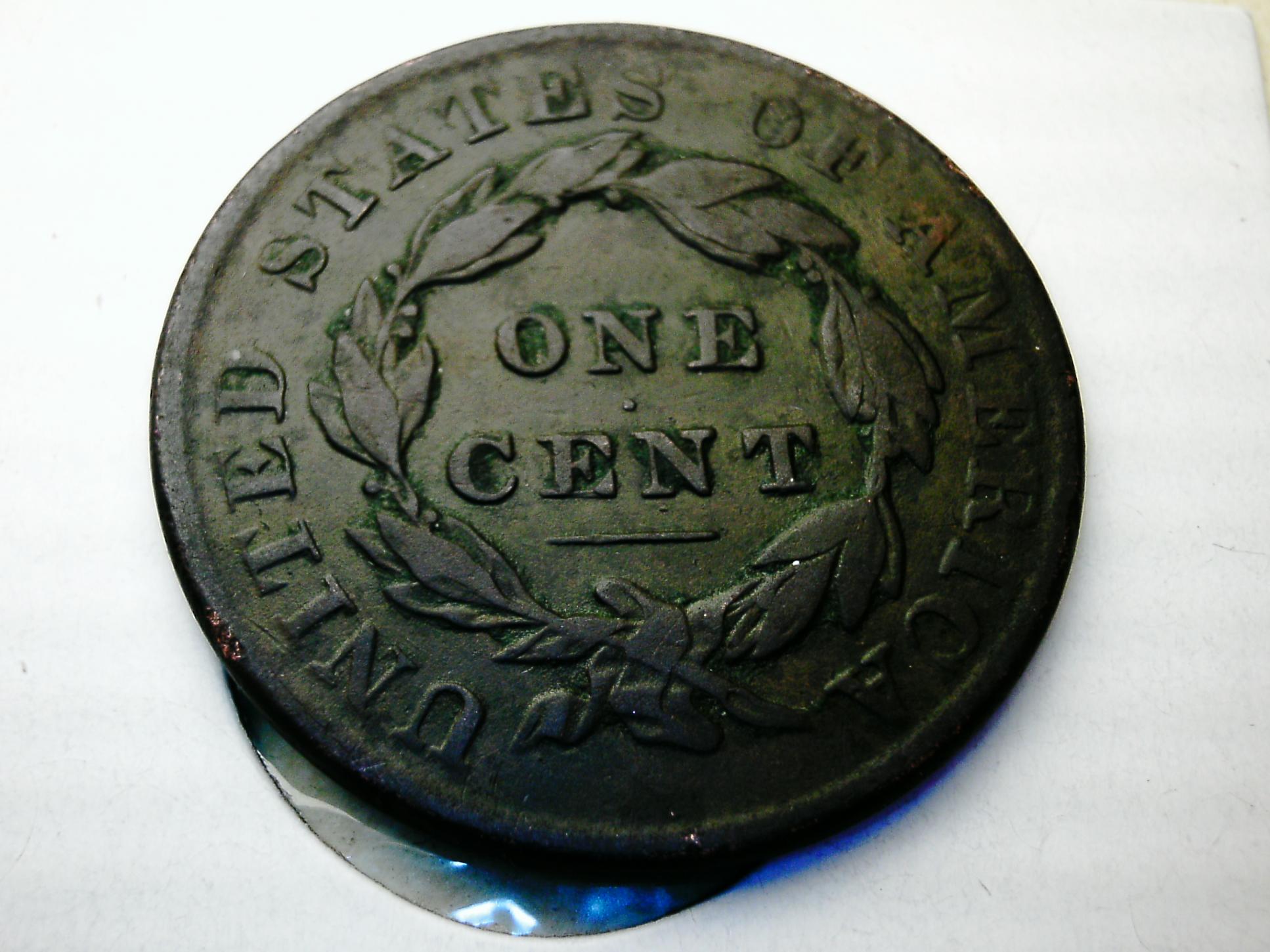 Got my "blurry" pic 1833 large cent in today and it is a truely beautiful coin (to me anyway lol) However the pic hid a rather strange issue. One of the previous owners dipped the coin in...................Wax! Mint green wax at that. Now the question is this. What is the best way to remove the wax from the coin without hurting the coin? here is a closeup of one of the heavier coated areas here is the same area after I "scratch" the surface with my fingernail (notice the flakes of wax) So again the question is what is the best way to remove wax from a wax coated coin?