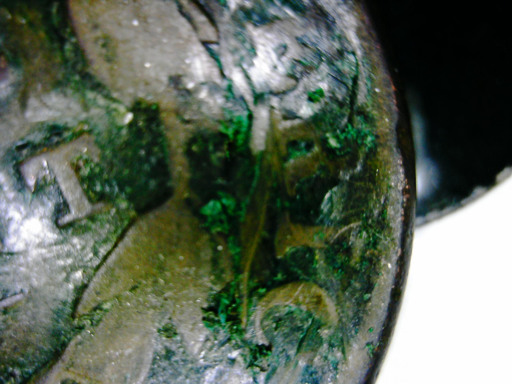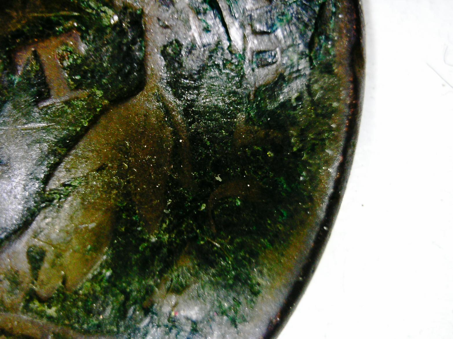 thanks tom while it may very well be some verdigris, I am sure it is wax and not just "crud" the entire coin is coated with the wax. I have however found my 1st step that i should have thought of myself, I will be "dipping" the coin in near boiling distilled water as a 1st step. This is the method I found recommended for the removal of "renwax" which is a material apparently often used to "preserve" coins by museams. I can't see hot water damaging the coin in any way and I will dip it using nylon tipped forceps I usualy use for jewelry repair. This way the coin won't be bounced around on the bottom of a pan. I will let you guys know the results of this 1st attempt