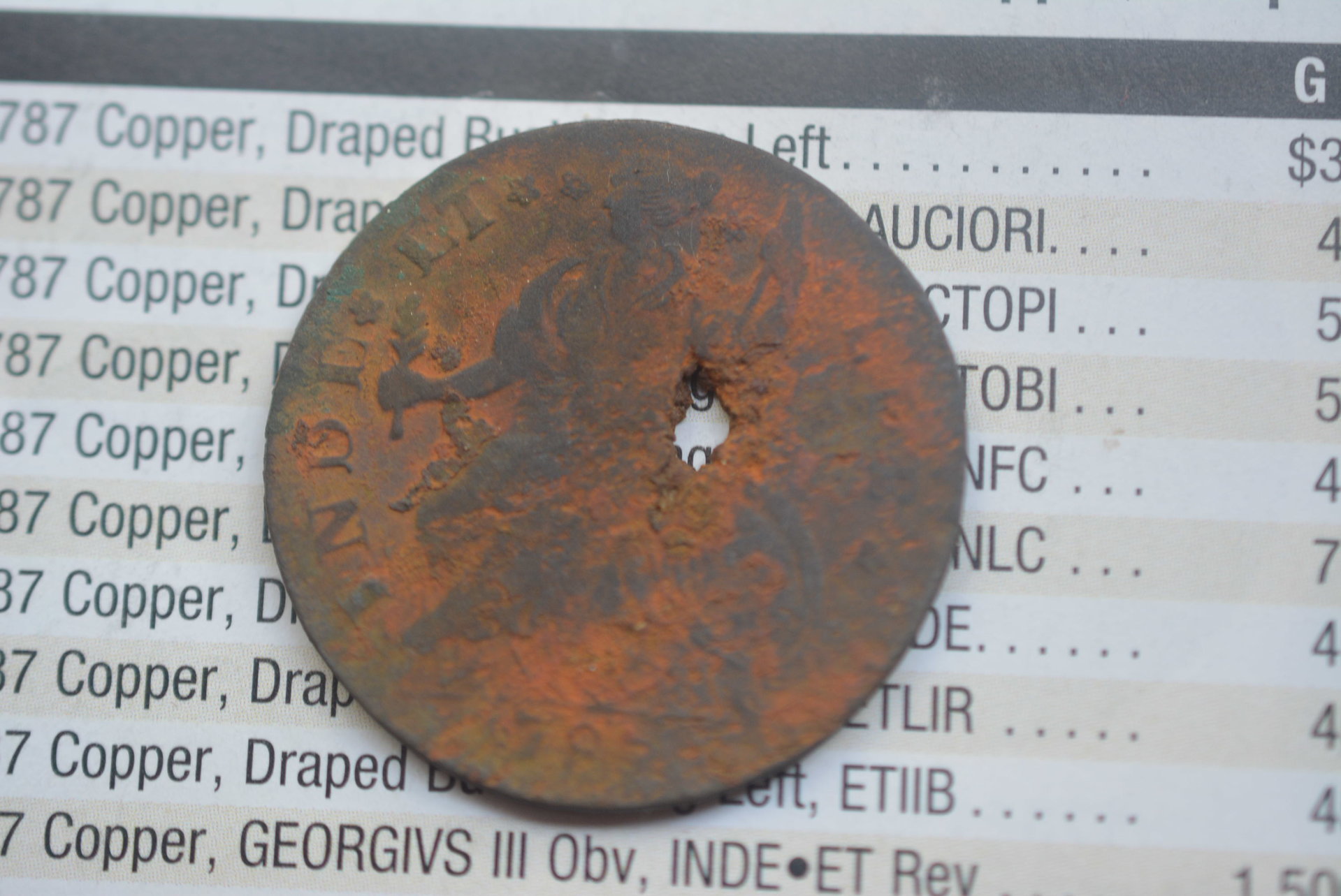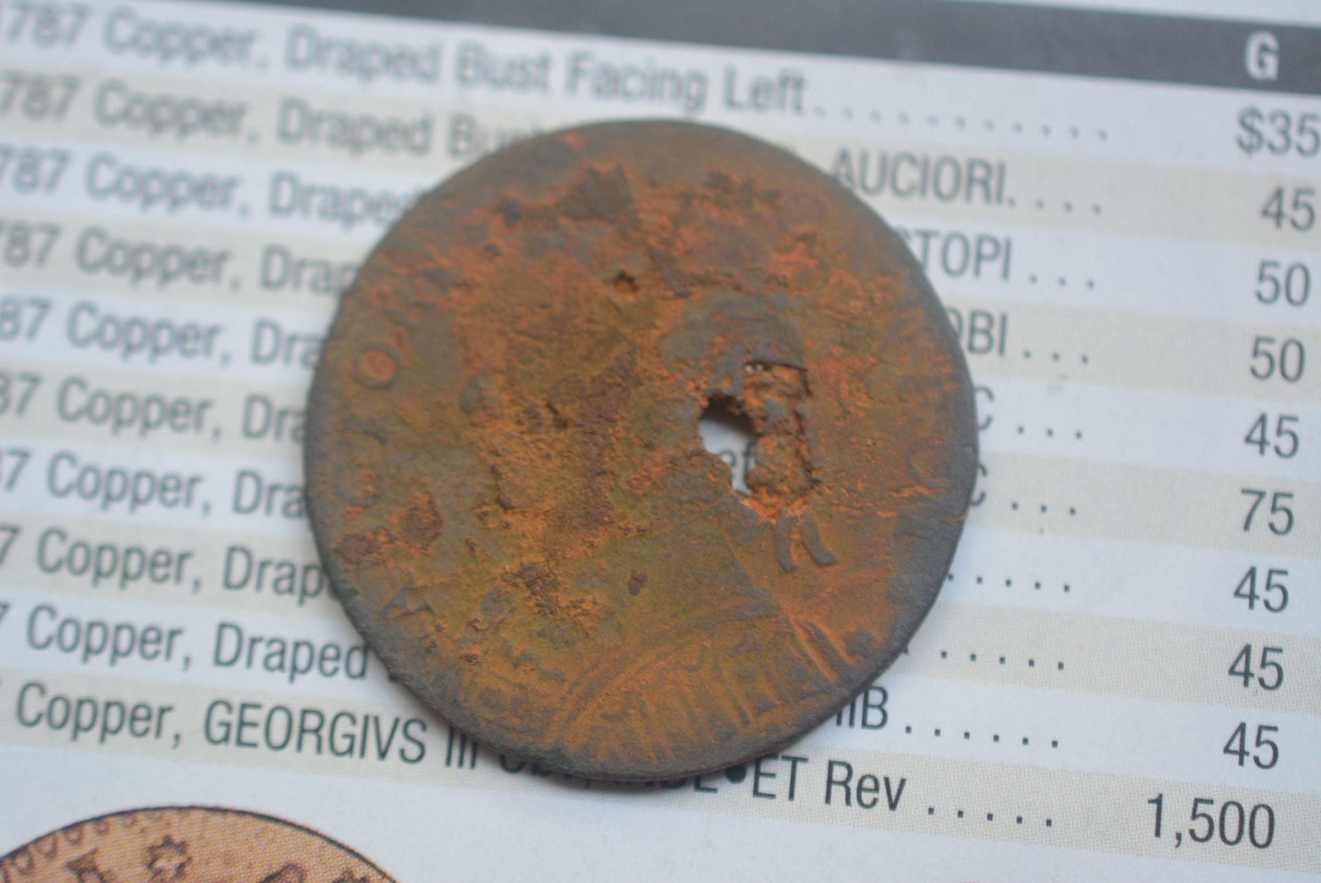That is an amazing find, not for the numismatic value as thanks to corrosion and the hole it is very low, but for the historical value. This was used in Early America. (Too bad on the West Coast I have to buy one, but at least we have more S-mint coins...)