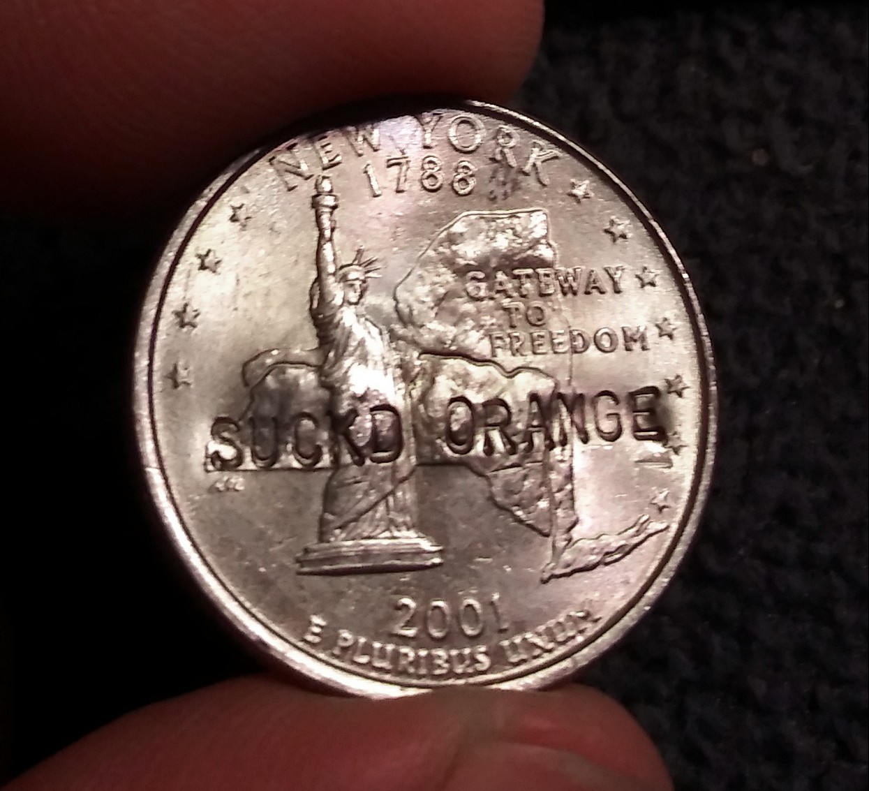 You might find it a little unsettling, but hey, free money! Kooky? Sure, a little. Fine by me- I'm a bit kooky myself. This is a generous person who obviously enjoys being mysterious. I know this because I too received cash in the mail (including counterstamped quarters) from the same source. Except I didn't get a $50 bill. I got Benjamins. Yes, Benjamins, plural. And they were real. This mysterious benefactor is known only as "The Quarter Master", and somehow he knew I had been laid off. (Obviously reads these forums.) So it seems he wanted to help (the letter said as much). And boy, did it! Gonna use those C-notes to fix my old jalopy before I go back to work. Had it towed to the shop today. No, I don't know his true identity either, though I've gotten some nice letters. If the guy is gonna throw Benjamins at me anonymously, I won't complain about that. I know some of y'all are spooked and suspicious, but I think it's sincere and all in good fun. Just the other day, I found an unopened Quarter Notes letter in my briefcase, which had arrived before my layoff at work. In the subsequent hoopla, it got shunted aside with some junk mail. Realizing I had better open it, I did, and sure enough, there was another counterstamped quarter and yet another Benjamin! In this note, the Quarter Master wanted to buy five sets of my elongated coins, and to have me give them away on the forums. He short-changed himself - I sell those sets for $10, so that Benjamin buys ten sets, not five. I'll be doing that giveaway soon. Dear Quarter Master - if you read this, thank you. Your kindness really has helped. Don't sling any more C-notes in my direction- I'm doing fine and will return to work in early June. I'm sorry I initially overlooked that first cash envelope where you were buying those elongates. I'll give away ten sets of them soon- five here and five on Collectors Universe. Plus the regular giveaway. (Edit: giveaways are now posted and linked above. Sorry I can't toss around free Grants and Benjies like some people do. )