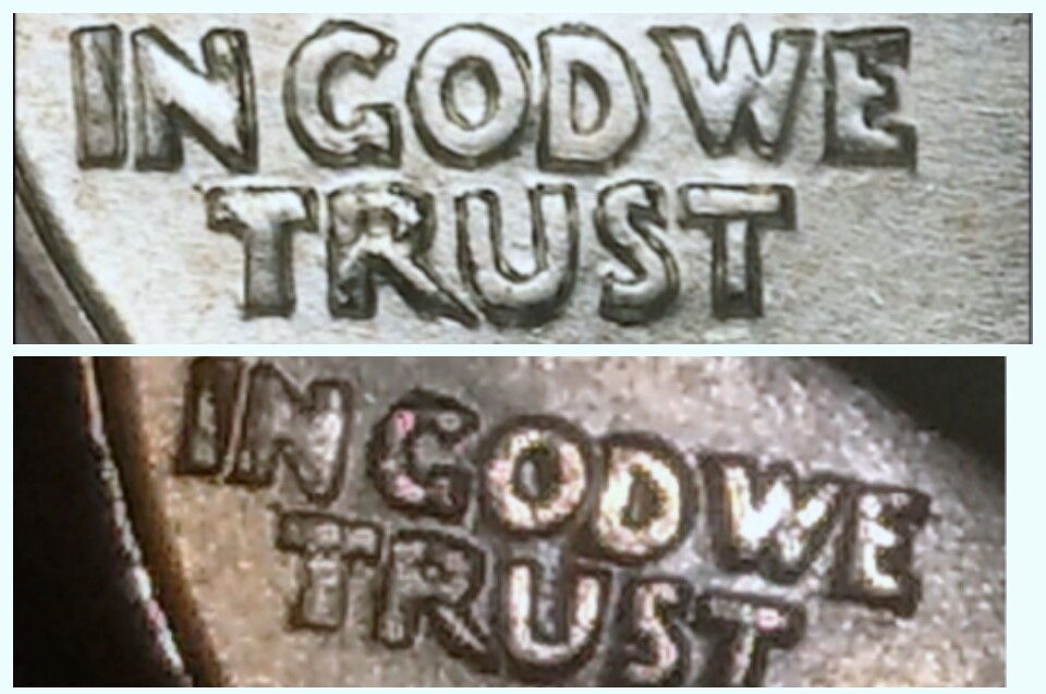 In general, die markers (other than breaks) close to the rim are unreliable because of the way a die wears. If I'm looking to confirm that two dies were the same, I look near the center of the design in a recessed area where a polishing line or two may show up. Features present in the devices or lettering may also be a result of the working hub, and not the working die. If there were a recessed, diagonal gouge in the I of IN that was not due to circulation damage, for example, I would expect that this would have been in the hub, and that several working dies had this feature.