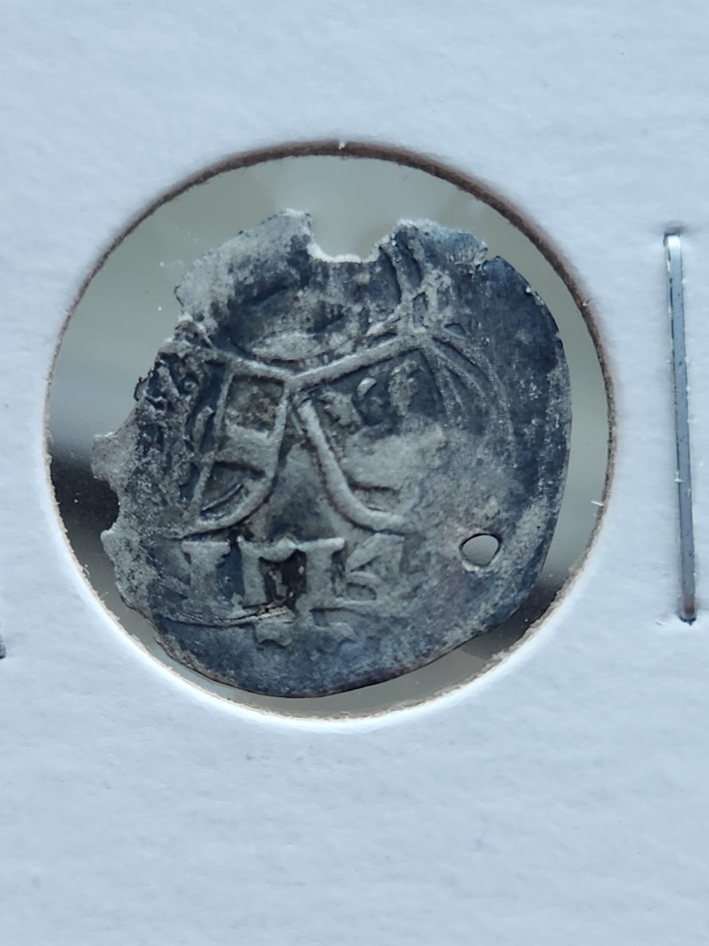 I have been trying to identify this hammered coin and keep coming close, but empty. The back is worn smooth. What's up with the backwards seven? For size reference, it is in a Penny flip.