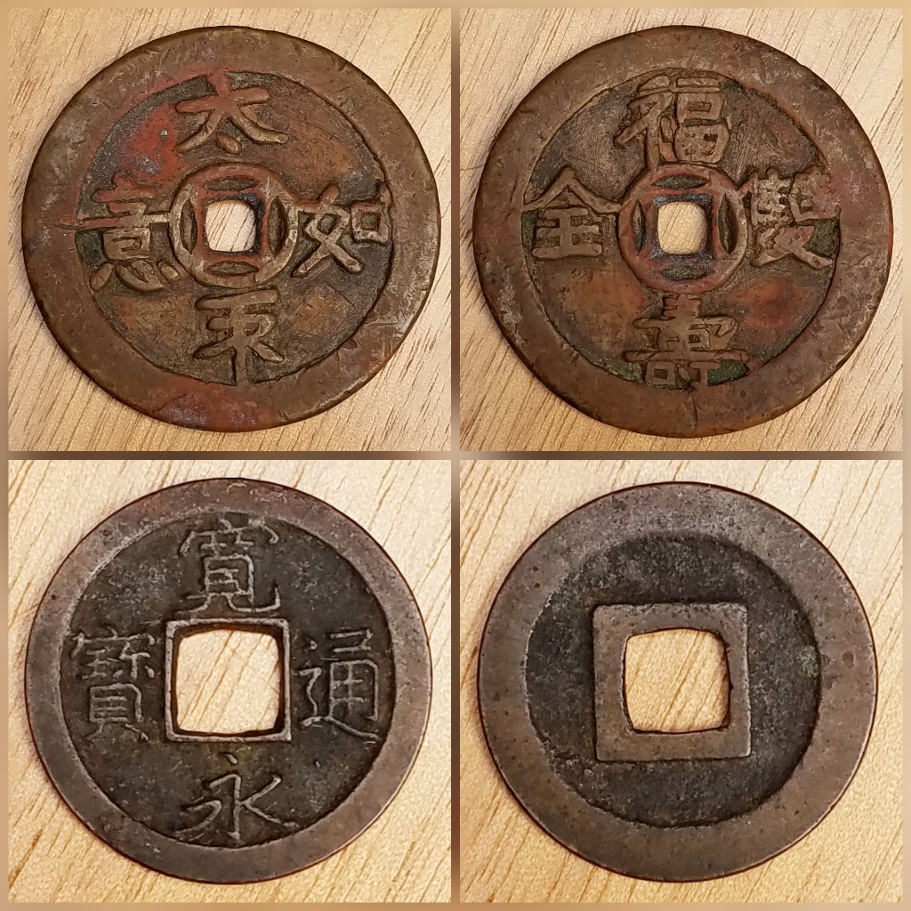 Hello, knowledgeable coin lovers, Once again I am over my head trying to ID a couple of Chinese ‘cash’. I stumbled into quite a hoard, these last two have proved elusive with my limited abilities. The top one with the reddish highlights measures 41 mm wide (sorry, my gram scale is at home so no estimation of weight) and the bottom one is 19 mm. I greatly appreciate anyone who can share their insight. Thanks, Coin Kitty
