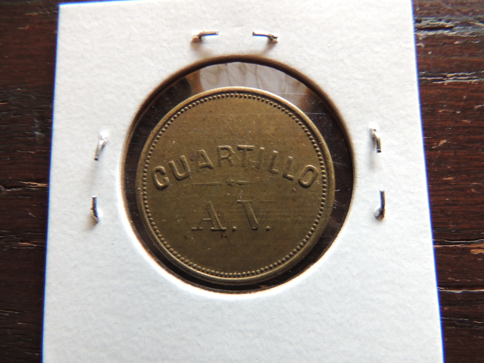 Hello, here is the coin in question. The Cuartillo A.V. side looks normal to me but the other side makes me think this coin is old. Also, the obverse and reverse have a 90 degree rotation difference like any US coin. I would say the token is made of brass. Online research has not helped me. Thanks for the help!