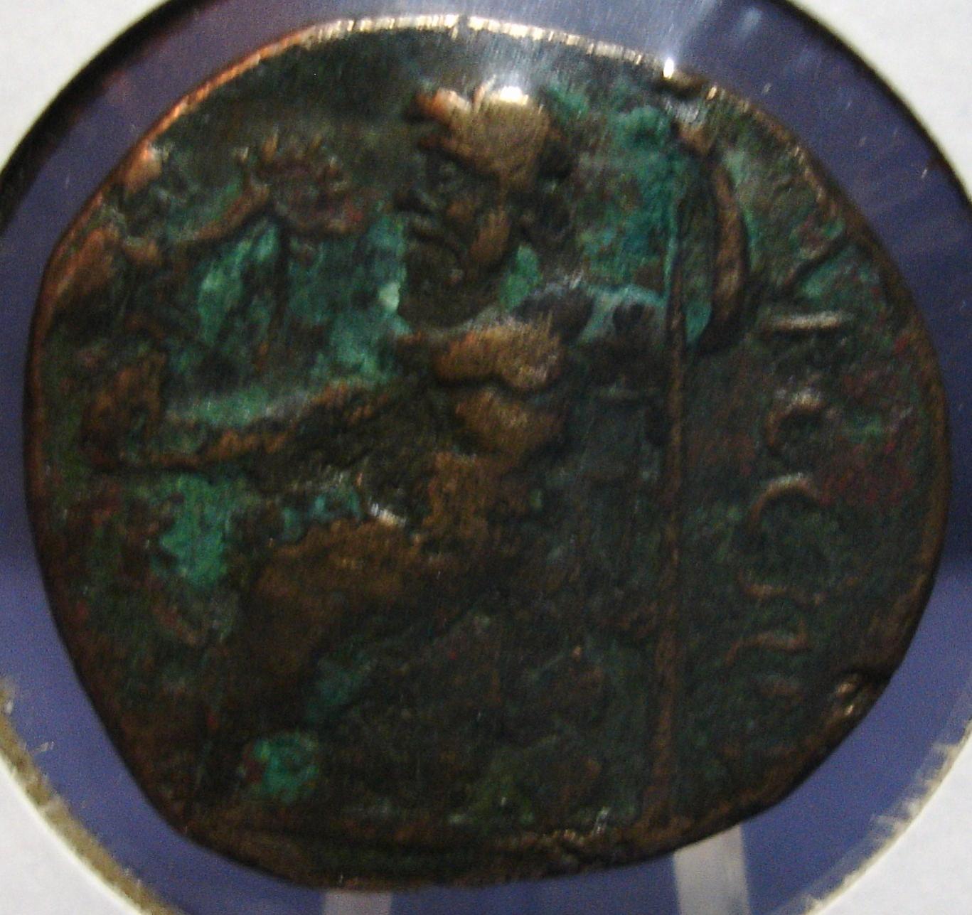 I believe what you have is " Tarsos, Cilicia, c. 1st-2nd Century AD ). The obverse (your second picture) is Tyche seated right on throne without back, holding stalks of grain, river-god "Kydnos swimming right below. The reverse (your left picture) is Zeus enthroned left, Nike in right, long vertical scepter in left. This is a very rare variety by the way and can cost in the near hundred dollar in those conditions. CONGRATS!