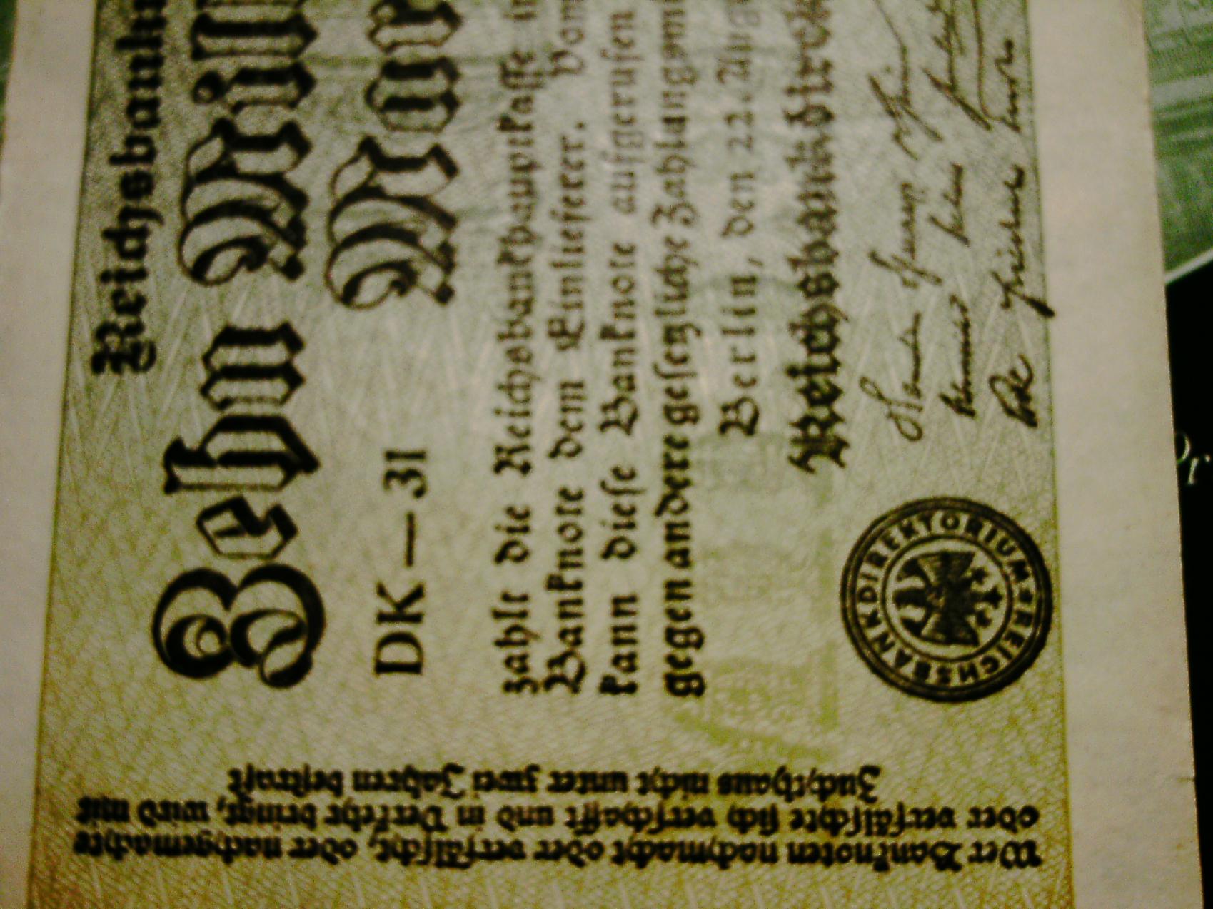 def german cuz of eagle symbol, and i dont know german but if it a 10 million mark note, id guess its a note from weimer republic