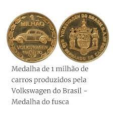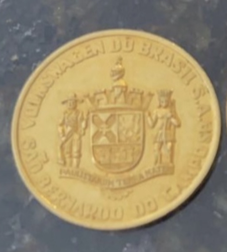Ah, a medal commemorating the production of the 1 millionth car by Volkswagen of Brazil. Cool. Duolingo Portuguese is finally starting to pay off... Text: Ob: 1 Milhão (1 million) Volkswagen, 1970 Rev: Volkswagen do Brasil S.A. (Volkswagen of Brazil Company) São Bernardo do Campo (city name)