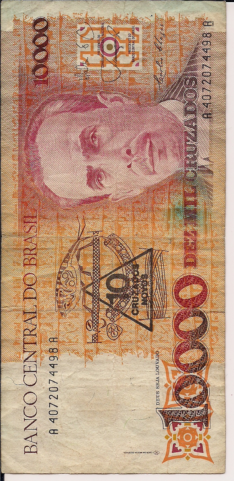 The note actually has a new denomination stamp - in the triangle you can see "10 Cruzados Novos". This New Cruzado was introduced in 1989. Today Brazil uses the Real ... Christian