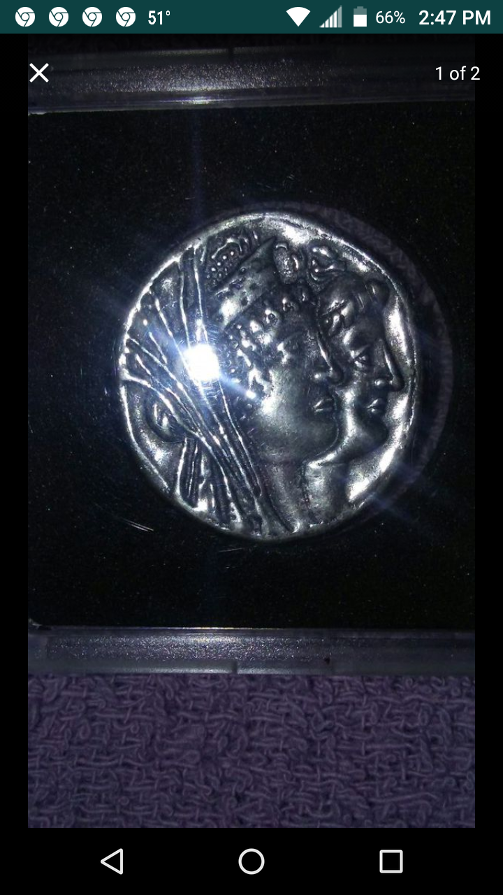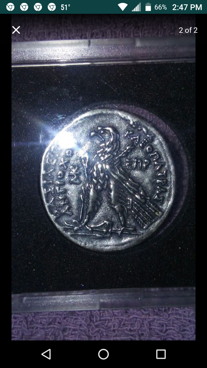Edited to correct my mistake. There is a rare Seleukid coin with this iconography: (from CNG's archives). Your coin looks like a modern cast though. SELEUKID KINGS of SYRIA. Kleopatra Thea & Antiochos VIII. 125-121 BC. AR Tetradrachm (26mm, 13.73 g, 11h). Askelon mint. Dated SE 192 (120/19 BC). Jugate heads right / Eagle standing left on prow left; palm frond behind; to left, AΣ above dove standing left; B(koppa)P (date) to right, AΣ between legs. SC 2276.2; Spaer –; HGC 9, 1186; DCA 256. VF, lightly toned, a few cleaning marks. Very rare. Your coin: