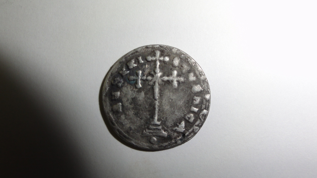 It's a Byzantine miliaresion of some sort, probably this one. I can't tell you much about authenticity, as I don't know much about Byzantine silver at all. Hopefully you'll find someone who knows Byzantines better than me to let you give you a better idea on that. So how did you come across this, anyway?
