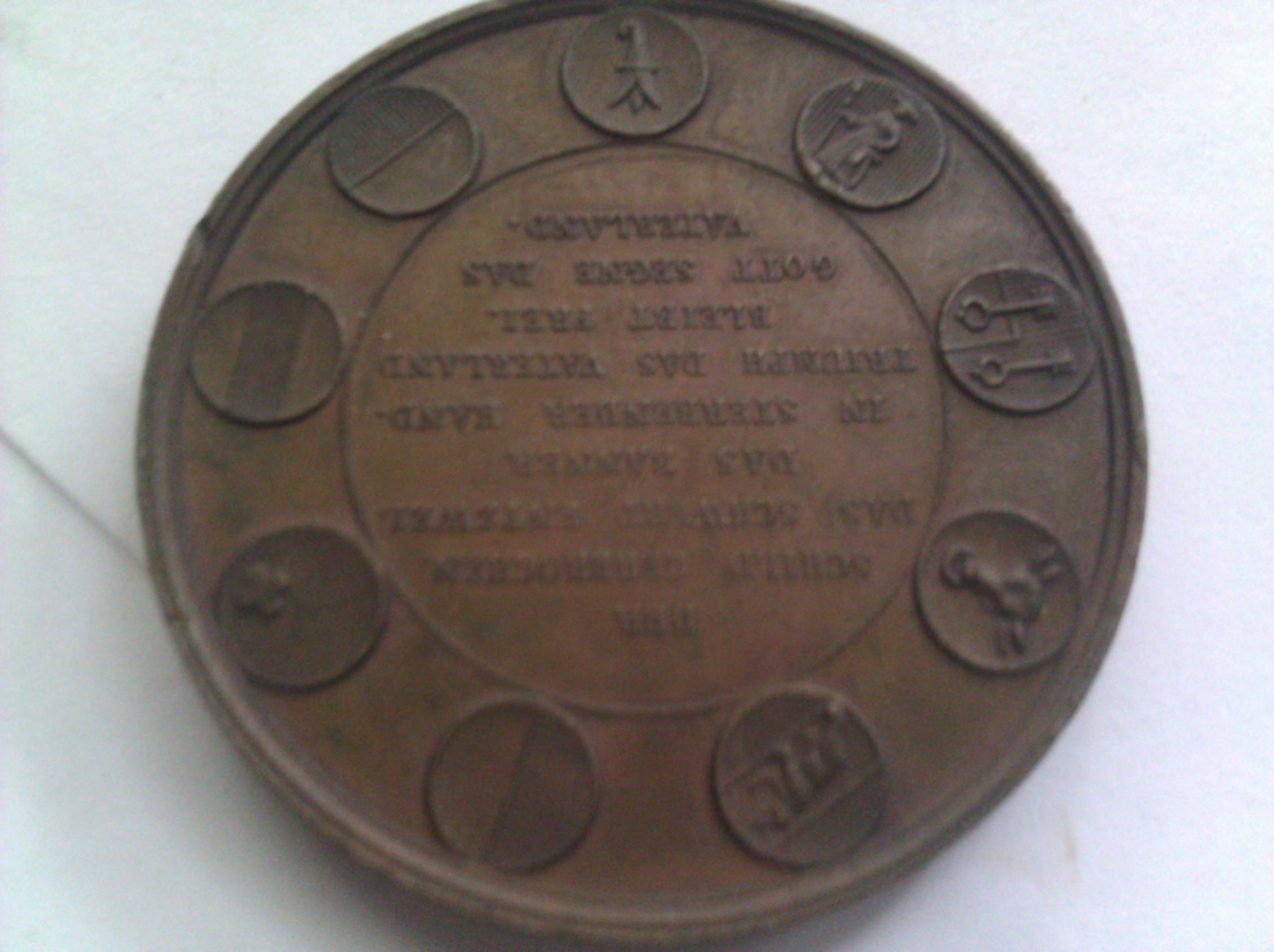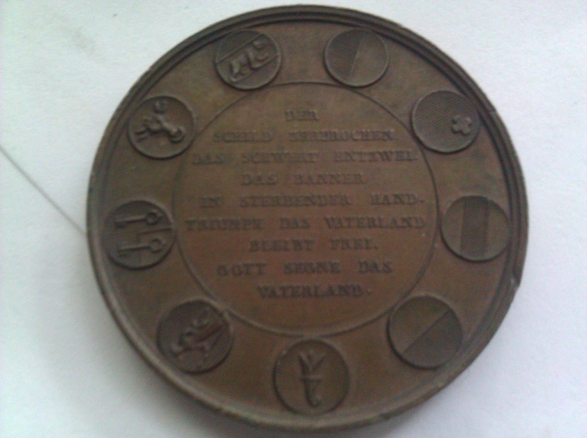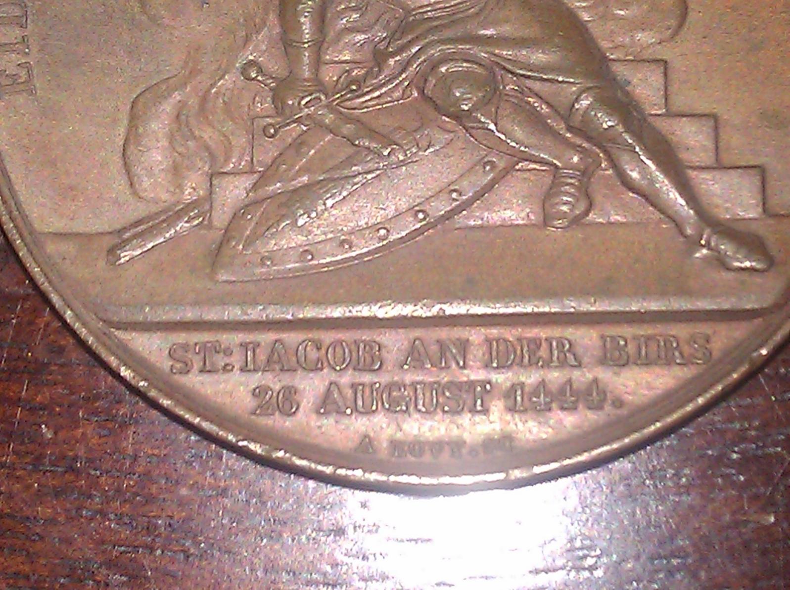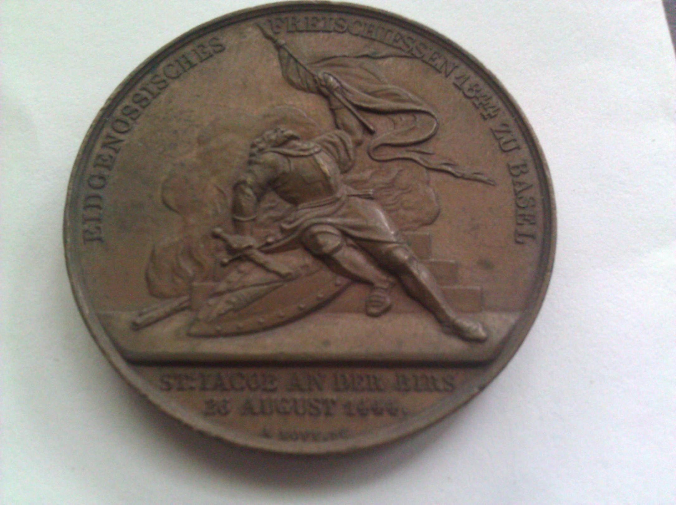 It appears to be a Federal Shooting Thaler (1844) produced by Jean Francois Antoine Bovy, 1795-1877. He usually signed his works "A.B." or "A. Bovy". The enlargement of the obverse is too blurry for me to read the letters following his name. Bovy is the name of a celebrated family of Swiss medalists and coin engravers, all of whom worked for the Geneva Mint.