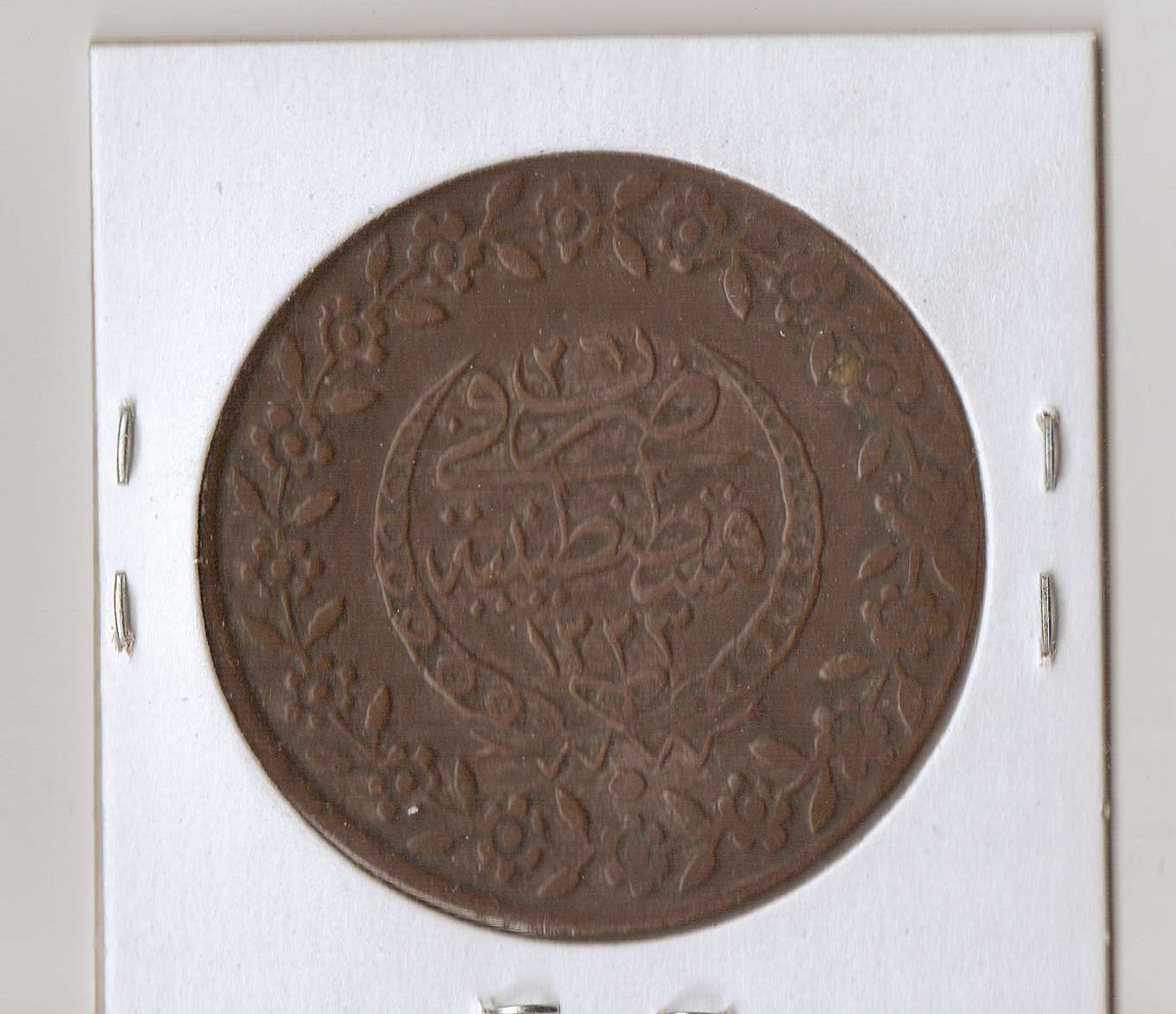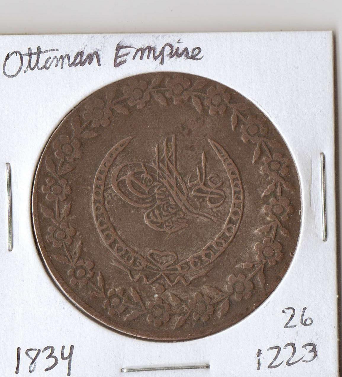 I'm trying to identify this coin. I'm sure it's from the Ottoman Empire/Turkey, and I have the date as 1223 (26), which I translate to 1834, though I could be wrong on how that works out. The main problem is that all the coins listed in Krause are silver, and this doesn't look silver to me. The coin is about the size of a U.S. dollar and doesn't really even fit in the $1 2x2. There are several coins in Krause that look like the one I have, but as I said, they are all silver, and I can't find a denomination listed on my coin. Any help?