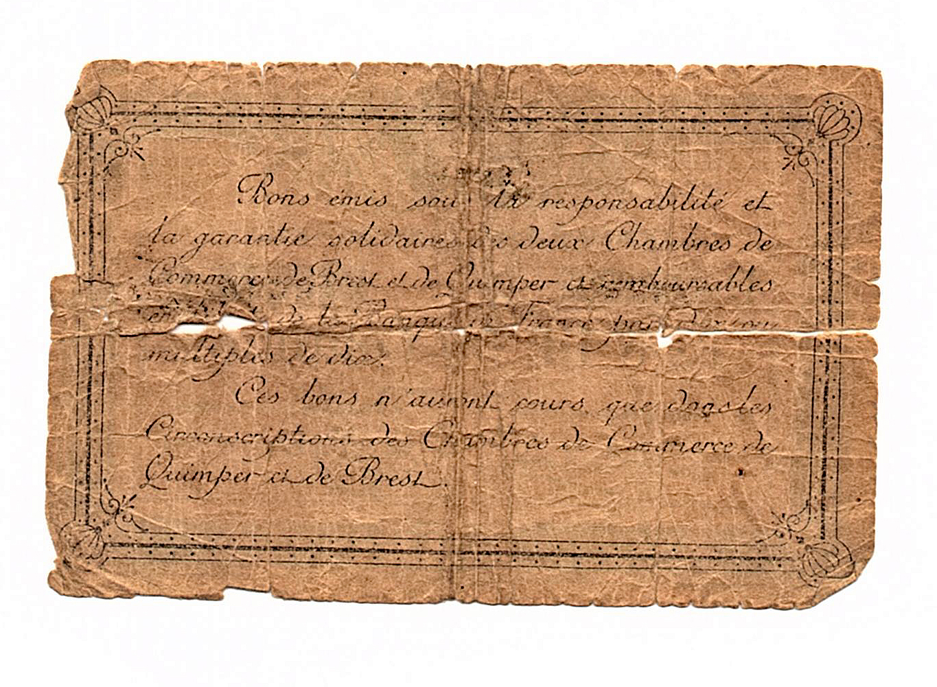 Here's two more items that are beyond me. I have a sneaking suspicion that the person who owns these (and the first one I asked about) is going to be very pleased with responses. I hesitate to call these two currency. They appear to be issued by the Chamber of Commerce. -- One is from Quimper and Brest -- The other from Nice. I don't know if they were treated as currency. The images are large mostly because their age and condition. View attachment 1631219 View attachment 1631219