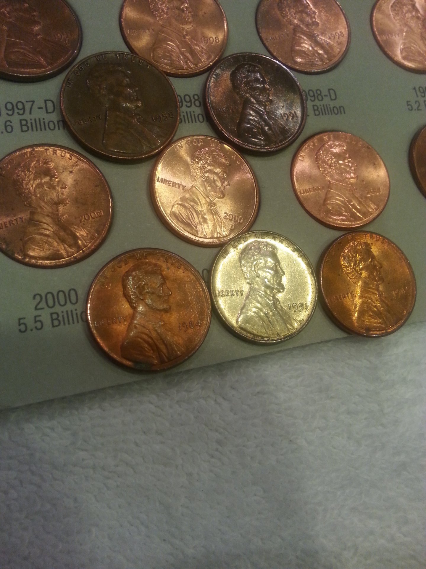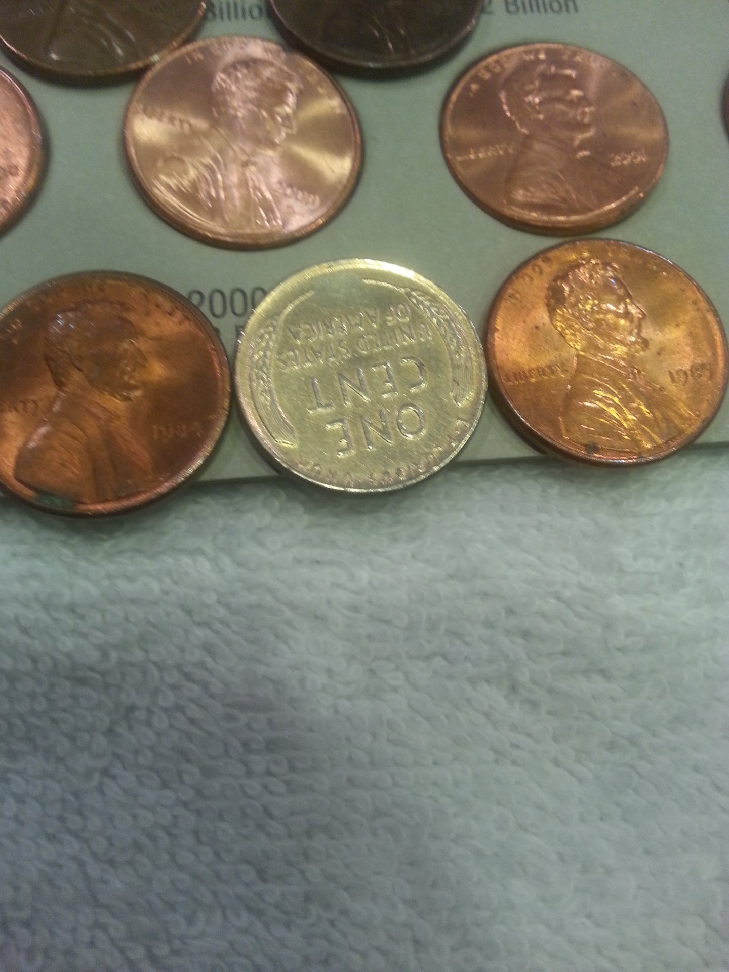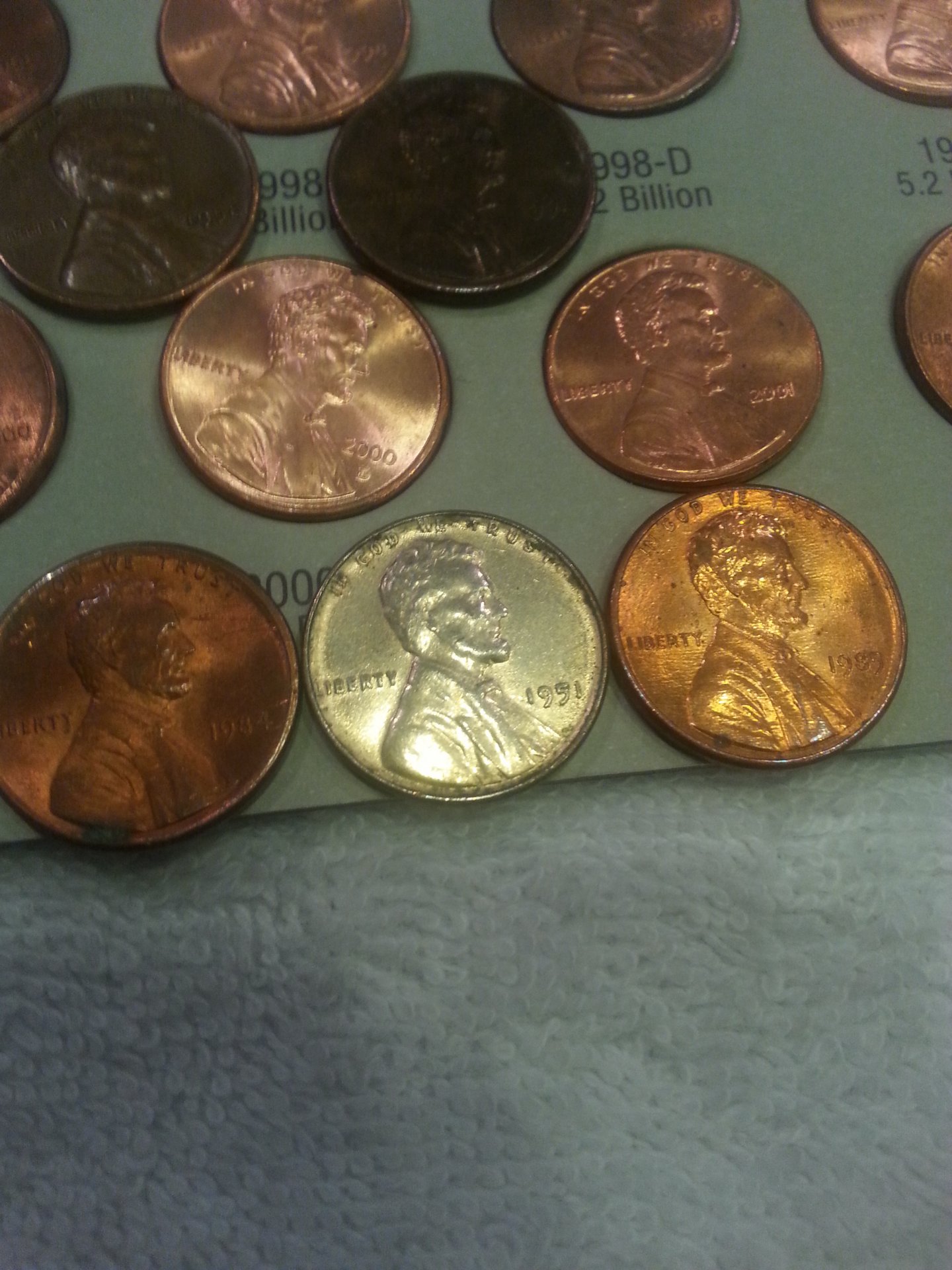 Greetings CT members, While roll-searching, I found this wheat cent, 1951, with a very odd color. It immediately stood out - bright and distinct. I put it with a sampling of other cents for contrast (to compensate for poor camera and lighting). These are my very first coin pics, with a cell phone, but hopefully some of the experts here will have some insights. It's in very good condition, but with a goldish color. Not the least bit copper colored, rather yellow-gold. Under magnification, it doesn't look in any way altered. Is it possible that this is a mint error - some composition imbalance? Or post-mint alteration? Have any of you seen this before?