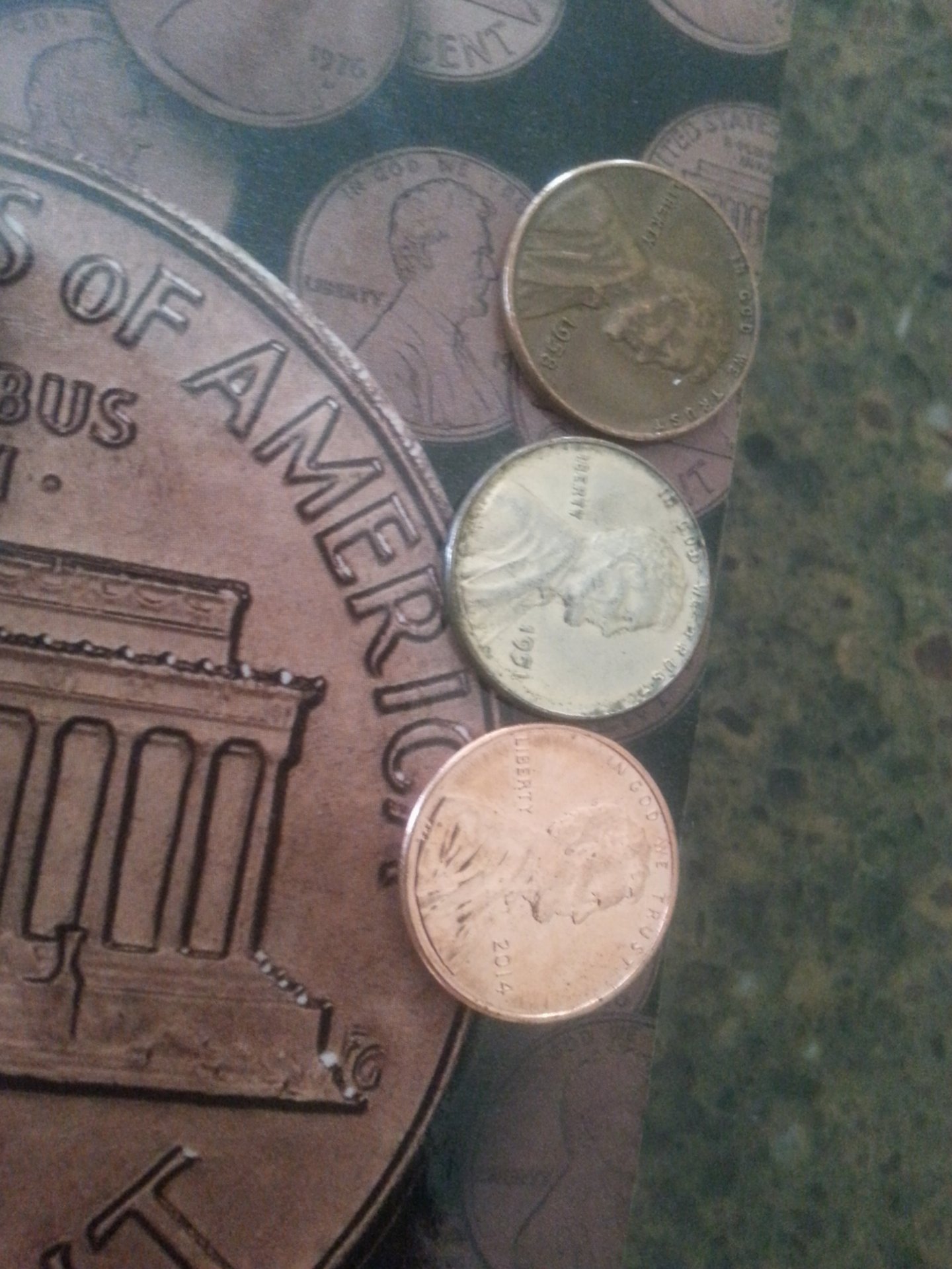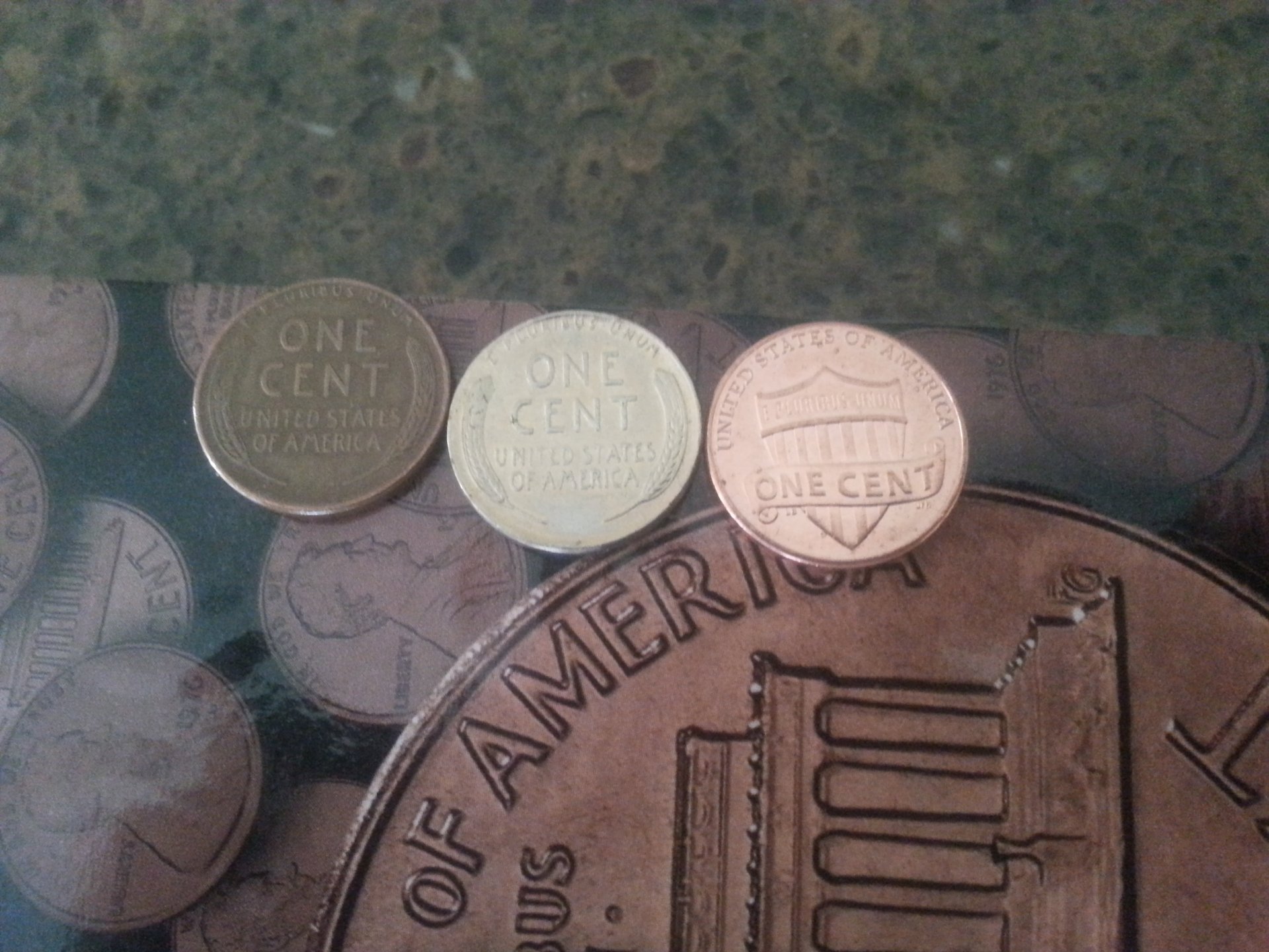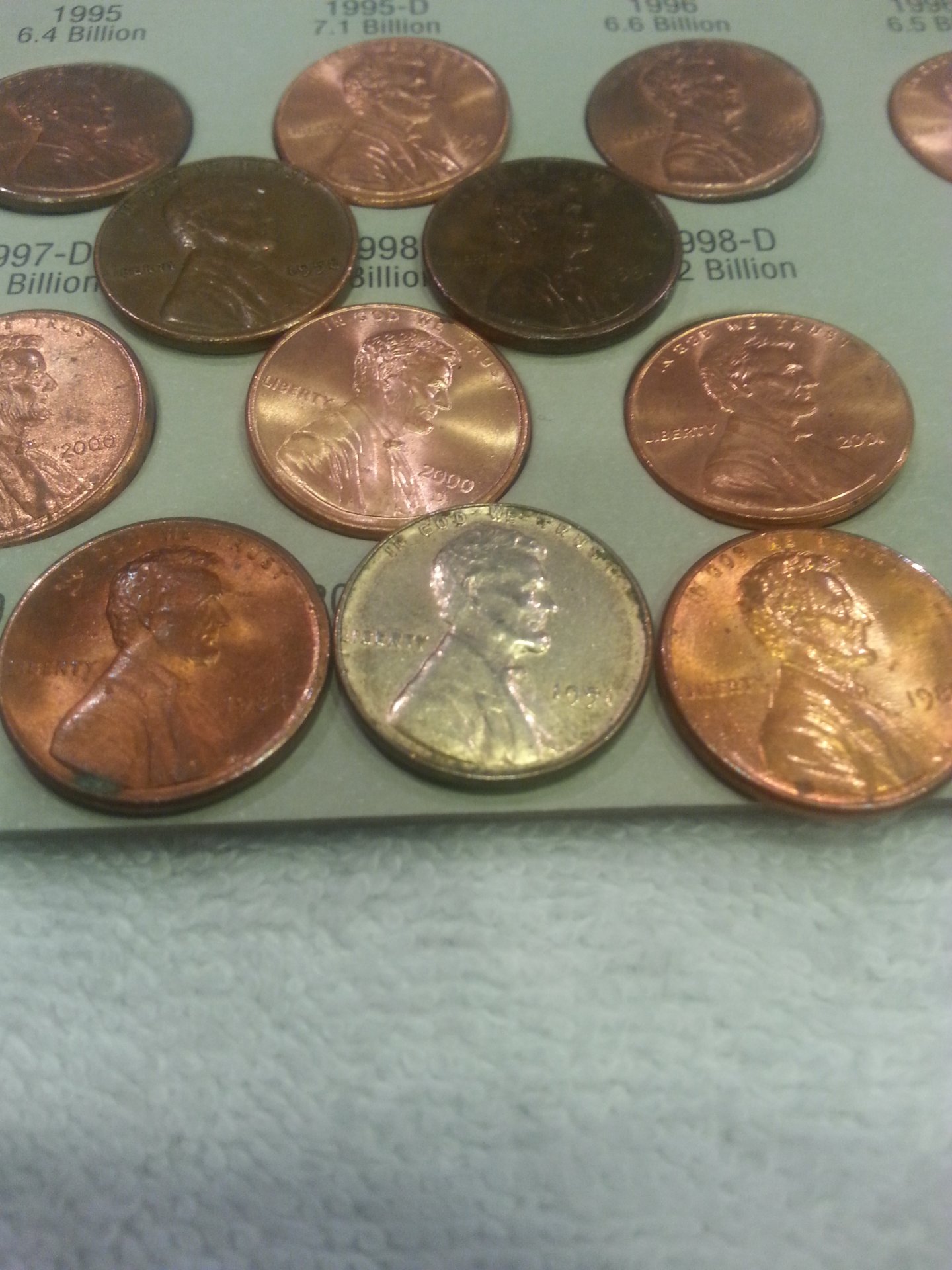Greetings CT members, While roll-searching, I found this wheat cent, 1951, with a very odd color. It immediately stood out - bright and distinct. I put it with a sampling of other cents for contrast (to compensate for poor camera and lighting). These are my very first coin pics, with a cell phone, but hopefully some of the experts here will have some insights. It's in very good condition, but with a goldish color. Not the least bit copper colored, rather yellow-gold. Under magnification, it doesn't look in any way altered. Is it possible that this is a mint error - some composition imbalance? Or post-mint alteration? Have any of you seen this before?