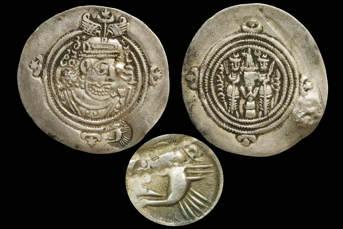 I know there is one person here that might like this one but I'll post this here rather than as a PM. What I learned since this coin arrive this week was that the large scrape in the reverse edge is to be expected with these. Coins bearing this 'bird' countermark all have a test cut, scrape or gouge suggesting that the countermark certified that the coin had been tested for purity. Compared to some I have seen online and in books, this is not badly damaged. The ID of the countermark as a bird is a matter of faith to me (I don't see it but I think the head is compromised by the double circle of dots). I believe the host coin is Khusro II, Shiraz (Shirajan) mint, year 36 but would like confirmation or correction.