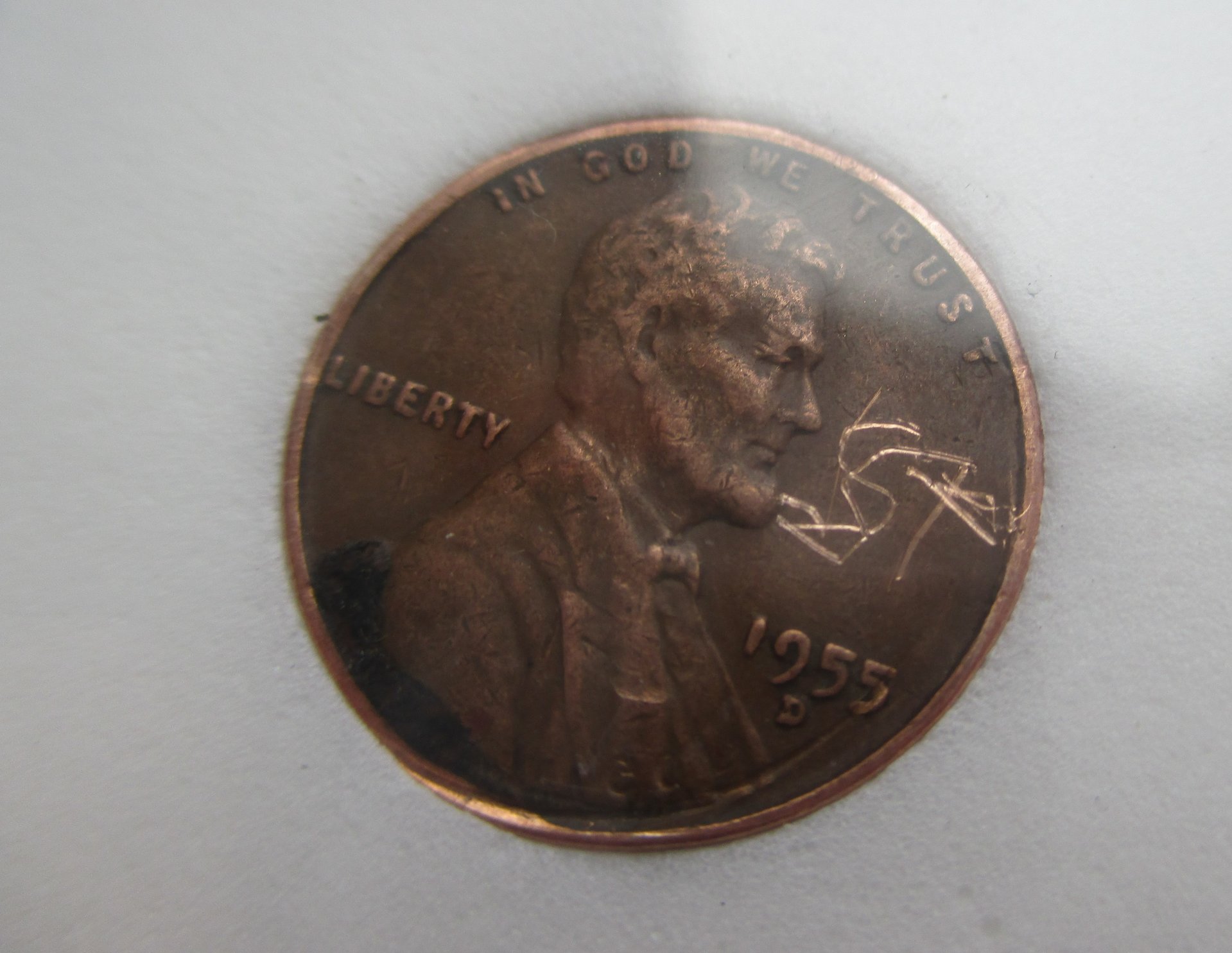 And, by the way, I would never use a 'nice' coin for something like this. This 1955-D cent was a cull and cleaned and had the sticky black stuff on it. I only use really rough coins for stuff like this.
