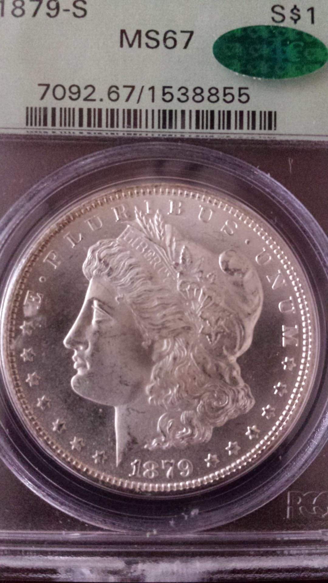 Thanks for the info, SD...I'm just surprised because some of those MS-67 CAC 1879-S Morgan's had the same description as the coin I have but 1/2 were going for about what I paid for mine and the other 1/2 were WAY above what I paid. Even if I remove the coin you think is an MS-68, there were a few other trades near $1,800. I'm just confused as to what I would say MY coin is worth...or whether I paid market, overpaid, or underpaid a year ago. I'm attaching pics, feel free to compare these to the list I saw at Heritage.