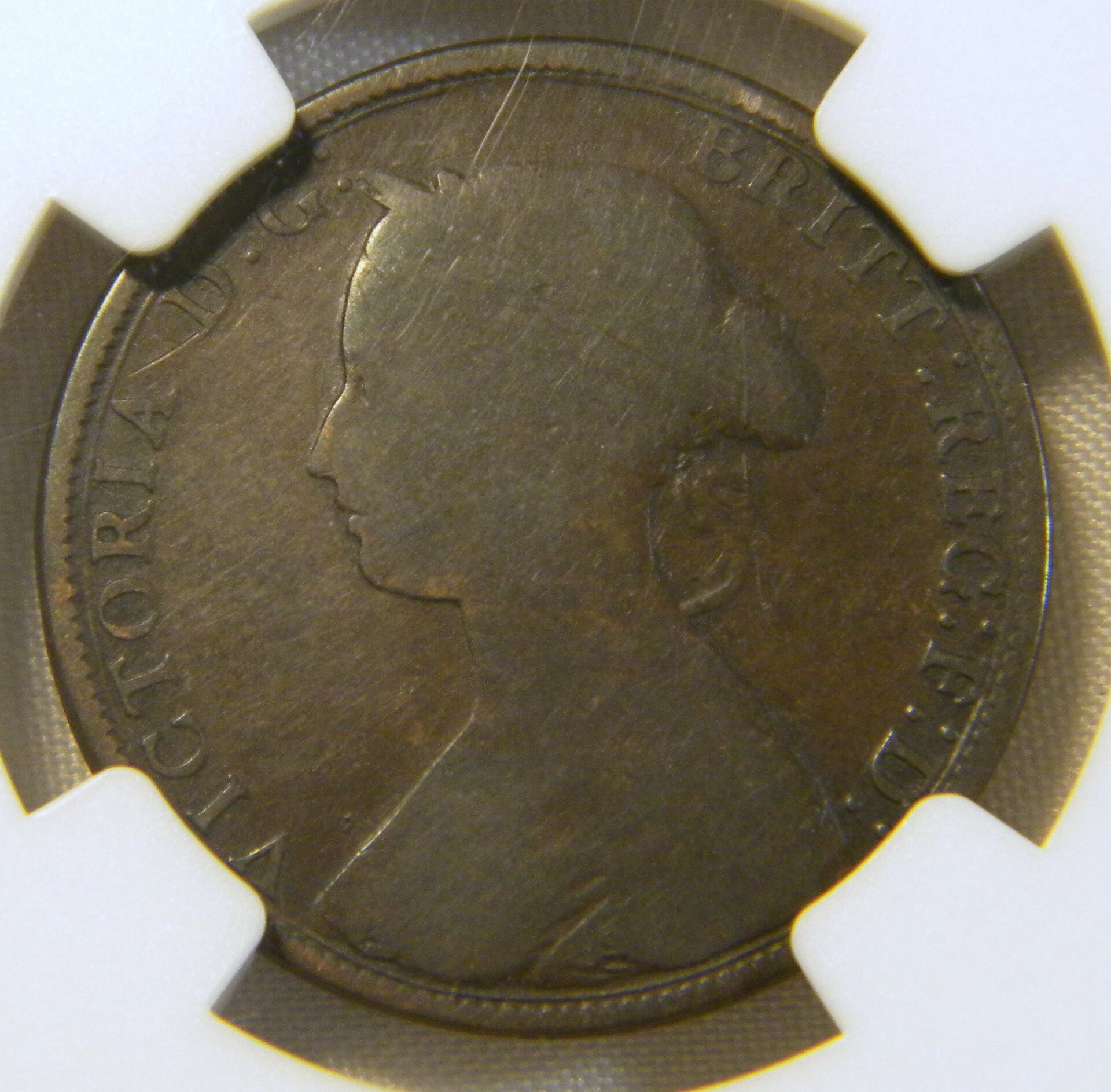 It's really hard with coins, because we're conditioned to expect the design to be in relief (raised). In that photo, look at the top of the coin. See the shadow cast by the plastic insert? That shows that the light is coming down from the top of the slab, with the coin below the level of the insert. Similarly, all the coin's design elements are brighter at the bottom, shadowed at the top, indicating that they too are lower than the fields -- but you've got to mentally focus to see it that way.