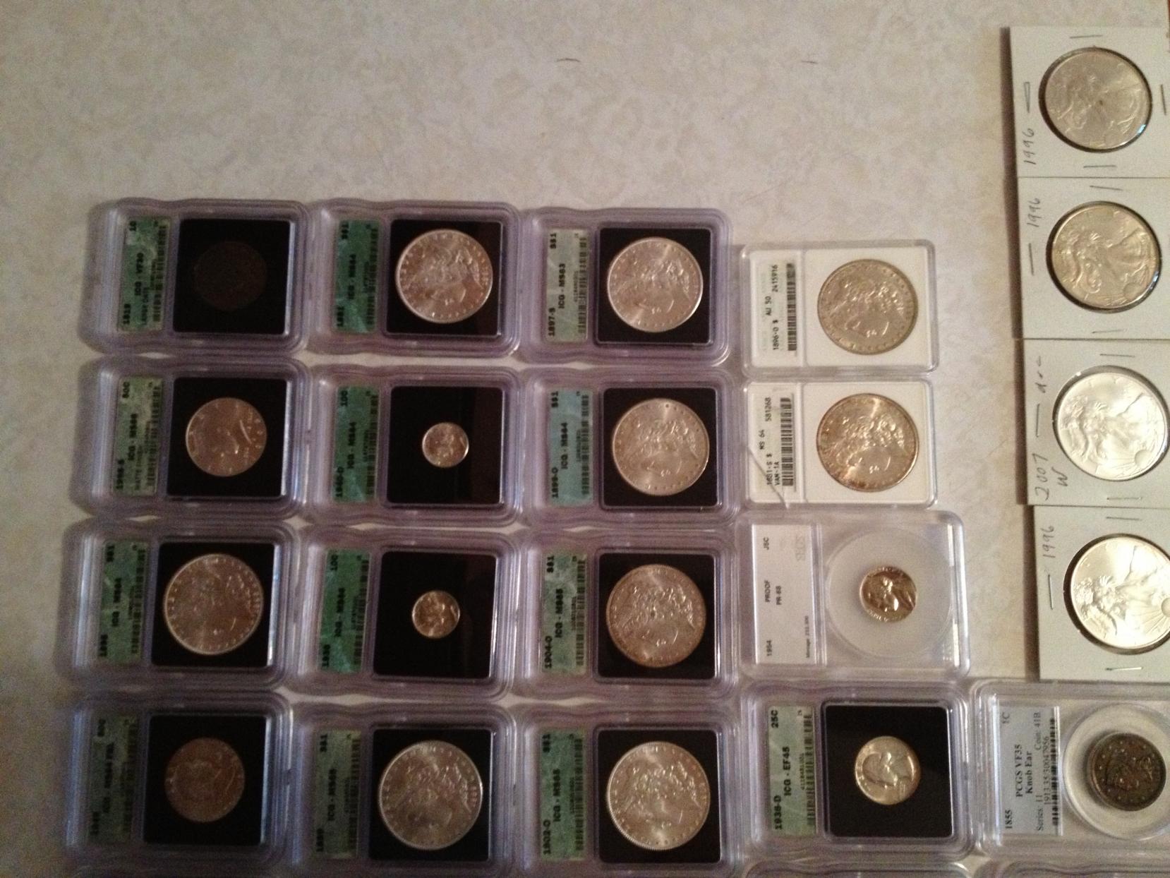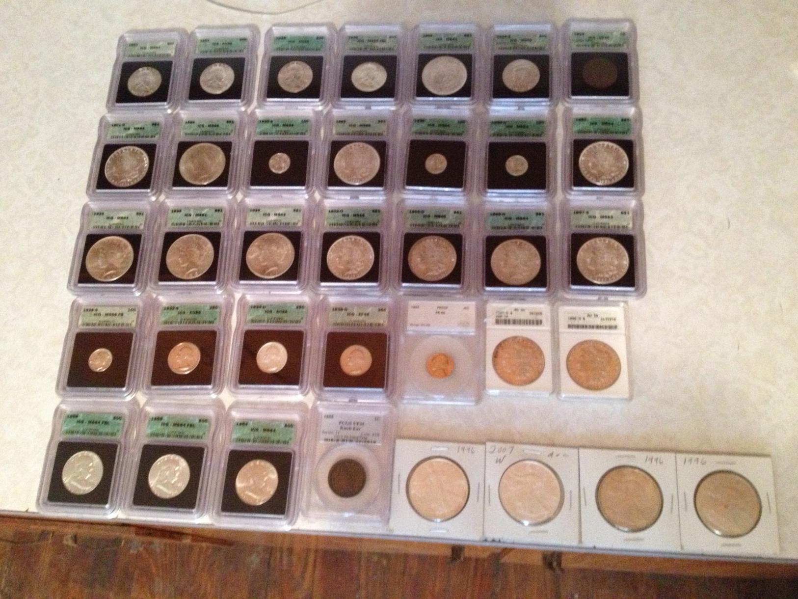 Unless noted, coins are graded by ICG Large Cent 1819 VF30 Large Date 1855 PCGS VF35 Nickels 1954 SEGS PR68 Dimes 1936 MS66 1938-S MS66 FB 1940-D MS64 1940-S MS65 Quarters 1932-S AU55 1934-D AU58 1936-D EF45 Half Dollars 1949 MS64 FBL 1952 MS65 1954 MS64 1955 MS64 FBL 1956 MS64 FBL 1957 AU58 1962 MS64 1998-S Matte Finish MS66 Dollars 1881 MS64 1881-S MS64 VAM-1A ANACS 1889 MS65 1896 MS64 1896-O AU50 ANACS 1897-S MS63 1899-O MS64 1901-O MS64 1902-O MS65 1904-O MS65 Peace 1922 MS65 1924 MS64 1926 MS63 1935 MS61 3- 1996 Silver Eagles 1-2007 W- Matte burnished finish I believe.
