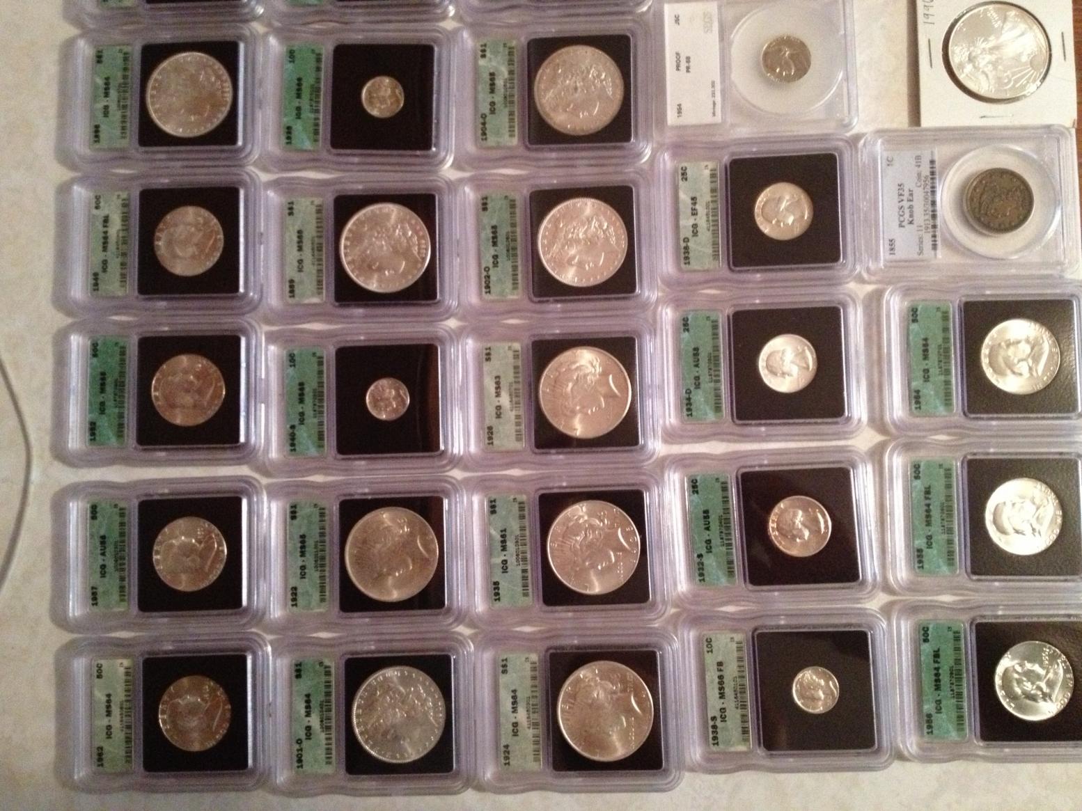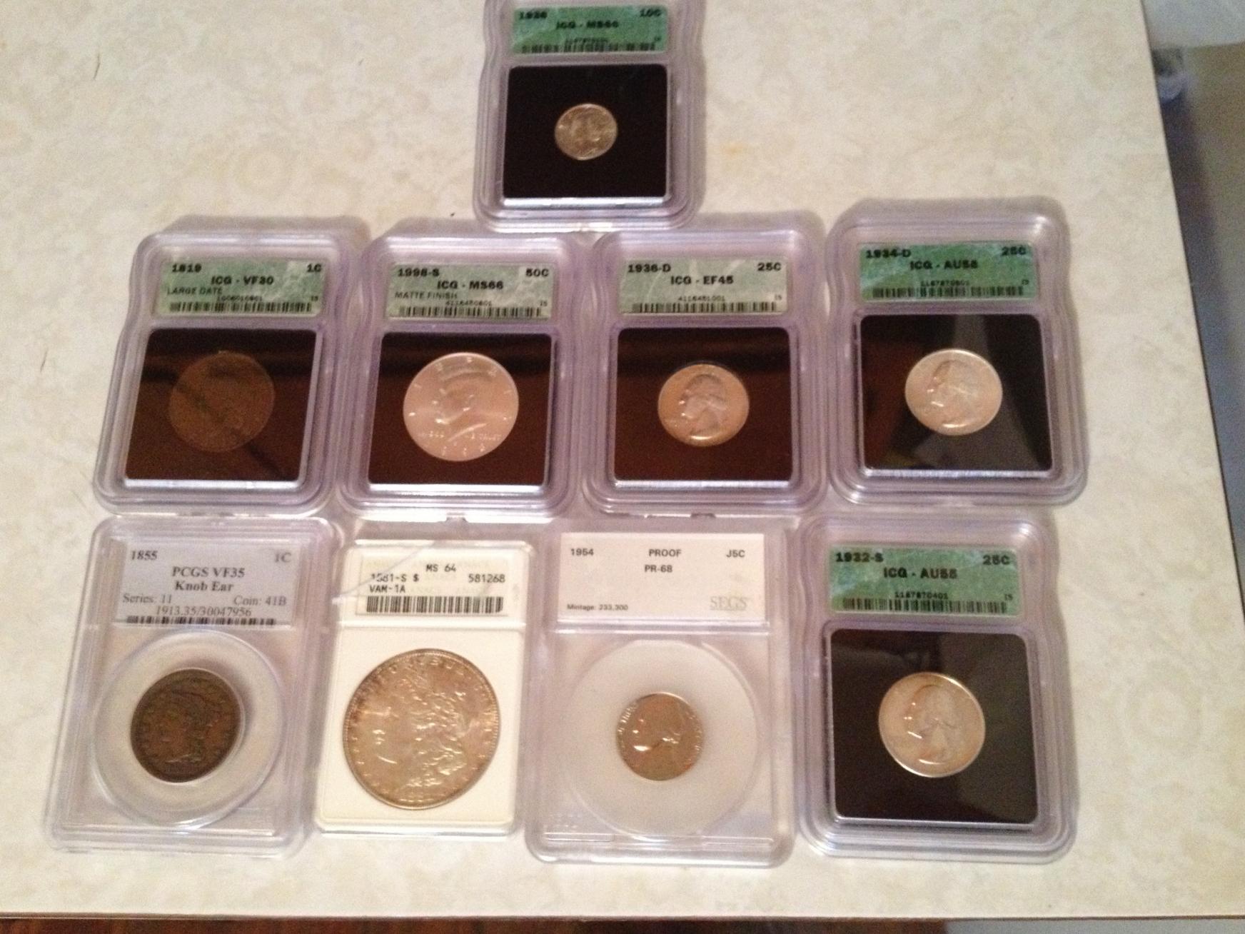 I'm somewhat lazy, so I'm going to do this the easy way, so you can do your own research... Large Cent 1819 VF30 Large Date - treat as VF25. 1855 PCGS VF35 - make note of knob ear. Nickels 1954 SEGS PR68 - treat as raw. SEGS = "self-employed grading service" or "self-evaluation grading system". Dimes 1936 MS66 - treat as MS64 1938-S MS66 FB - treat as MS65 without FB designation. If FB is confirmed, treat as MS64FB 1940-D MS64 - treat as MS62 1940-S MS65 - treat as MS63 Quarters 1932-S AU55 - treat as AU53 1934-D AU58 - treat as AU55 1936-D EF45 - treat as EF40 Half Dollars 1949 MS64 FBL - treat as MS63. If FBL confirmed, treat as MS62FB. 1952 MS65 - treat as MS63. 1954 MS64 - treat as MS62. 1955 MS64 FBL - see above. 1956 MS64 FBL - see above. 1957 AU58 - treat as AU55. 1962 MS64 - treat as MS62. 1998-S Matte Finish MS66 - treat as MS63. Dollars 1881 MS64 - treat as UNC details. 1881-S MS64 VAM-1A ANACS - treat as UNC details. 1889 MS65 - treat as UNC details. 1896 MS64 - treat as UNC details. 1896-O AU50 ANACS - treat as EF45 or AU details. 1897-S MS63 - treat as UNC details. 1899-O MS64 - treat as UNC details. 1901-O MS64 - treat as UNC details. 1902-O MS65 - treat as UNC details. 1904-O MS65 - treat as UNC details. Peace 1922 MS65 - treat as UNC details. 1924 MS64 - treat as UNC details. 1926 MS63 - treat as UNC details. 1935 MS61 - treat as UNC/AU details. 3- 1996 Silver Eagles - probably one worth $50-$60 (good luster) other two look like folks might treat them as bullion. 1-2007 W- Matte burnished finish I believe - You can easily verify this on your own.