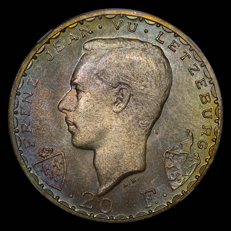 This is a "dark side" coin, but one of my favorite designs. This coin was minted in 1946 in Luxembourg to commemorate the 600th Anniversary of the death of John of Bohemia (also known as John the Blind). It was minted in 100,000 pieces. The NGC population is 5/0 and the PCGS population is 1/0 in MS67. The toning on this one was the "wow factor" that sold me, it just also happened to be a top pop!