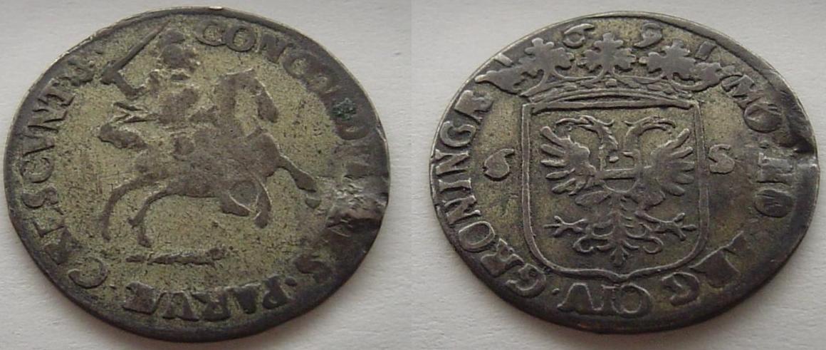 Actually the details for your Duit describe it as : Copper,Crowned Utrecht Arms with Lion supports, Reverse; VOC Monogram with date below. The STAR Mintamark is from one of two mints , Enkhuizen or Hoorn . Your 6 Stuivers (Schelling) Groningen & Ommeland should be silver, mintmark is a Dog (Varieties exist). My Dutch neighbour who has been in England over 50 years used to pronounce the English Shilling (Schelling)