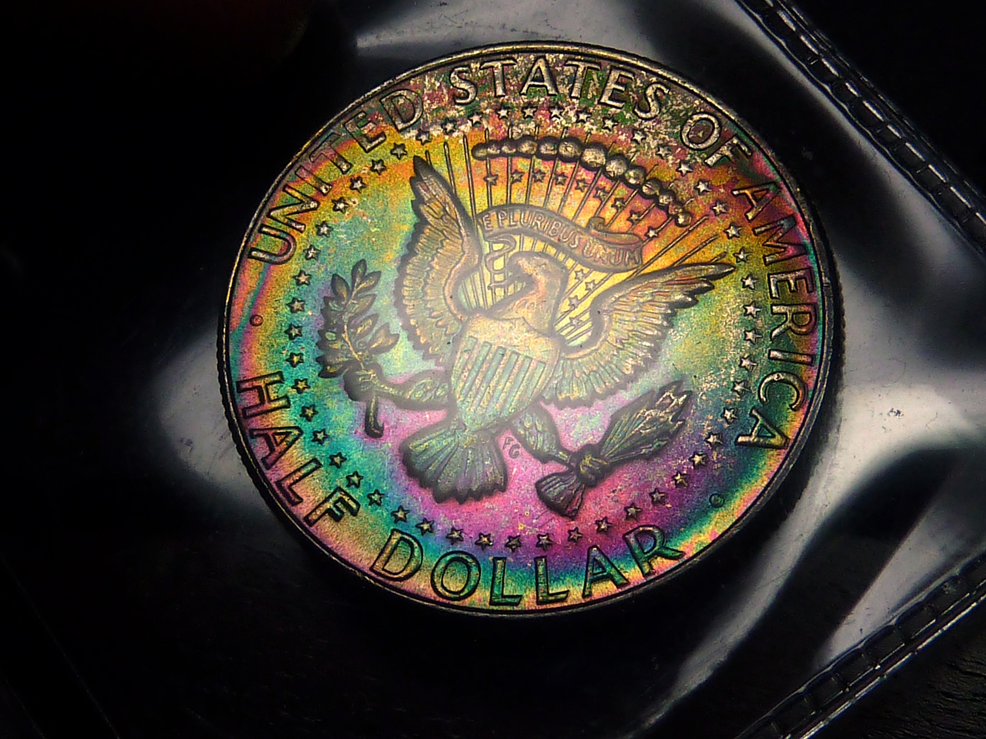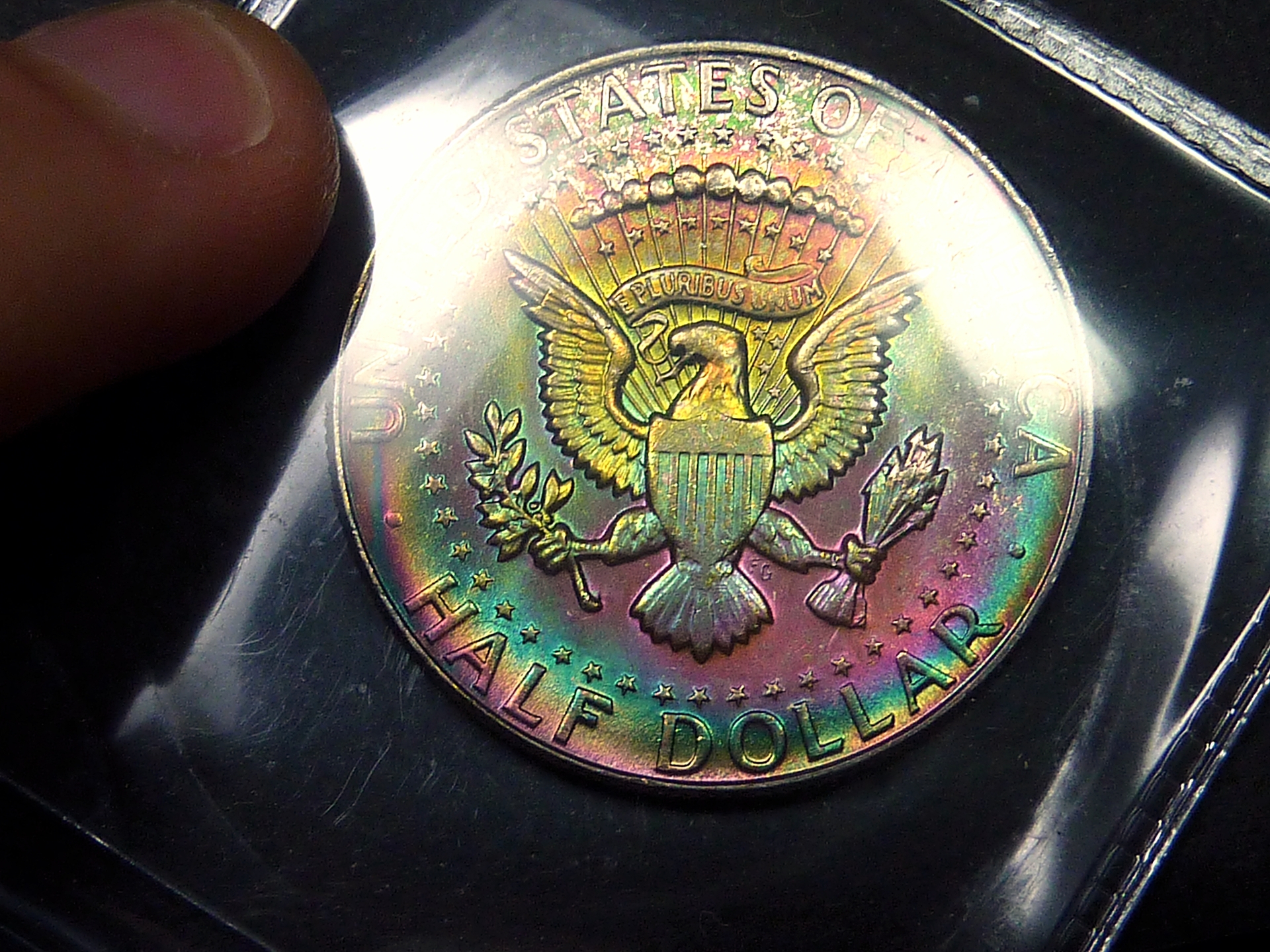 One thing that I've noticed with AT is that it covers an entire obverse or reverse when present and the colors are even more fluorescent. The break in the toning pattern on the reverse was the give away for me that it was natural.