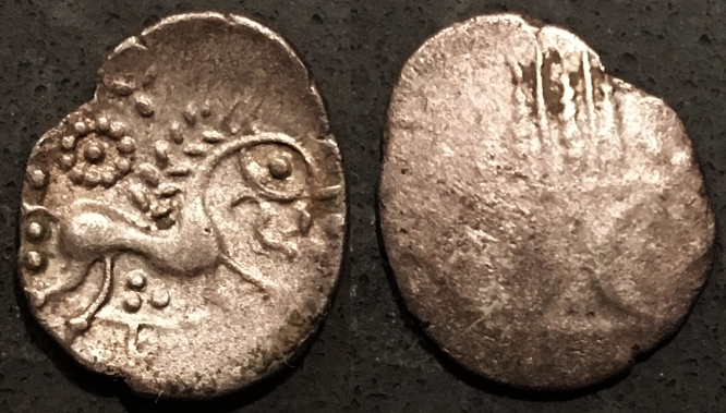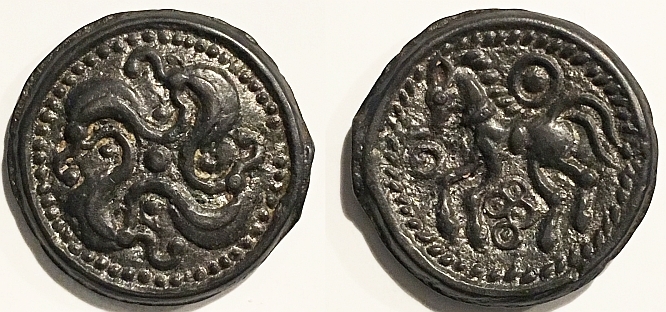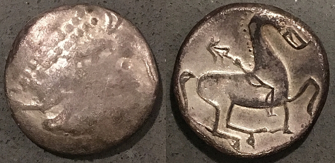 @Justin Lee I love your Larissa horse that's about to lie down! Very subtle. But if you say Horse, I say: Celts! The most beautifully artistic horses were made by Celtic celators. We saw already some from @panzerman and here are some more. Antedios, Iceni (Norfolk, Britain). A thin silver, hollow coin. Another, lovely Iceni coin, what a joyful work of art! Potin Senones, 80-50 BC. Obv. Head facing r. with 6 strands of hair. Rev. Horse l. with long whipping tail, two pellets in field. 20 mm, 3.57 gr. The Senones lived in the area around Sens. De La Tour 7417. Pictones (around Poitiers). Electrum stater 120-60 BC. Obv. Head of the god Ogmius. Rev. Rider on a human-faced horse. Under it, a hand. 20 mm, 6.23 gr. De La Tour 4395. Suessiones. Potin. Obv. Four leech-like forms. Rev. Elegant horse with ringlets. 20 mm, 5.17 gr. De La Tour 7673. A most beautiful foal with long legs and a large eye - basking in the sun. Iberia, Konterbia Karbika, AE unit (‘As’). After 133 BC. Obv. Head r., left a text, right an animal (dolphin?). Rev. Rider on a lively horse, text in exergue. 22.5 mm, 9.13 gr. Iberia, Castulo. AE unit. Early 2nd century BC. Obv. Diademed male head right. Little hand right. Rev. Sphinx standing right, raising forepaw, to right. Burgos 701 (or 544?). 30 mm, 14.69 gr. Eastern Celts. Pannonia. AE Tetradrachme, Kapostal type (Kaposvölgyi, Kapos river, 20 km north of Pécs in Hungary). Obv.: Head t.r. with granulated surface. Rev.: Horse and rider t.l. 21 mm, 8.95 gr. Eastern Celts, Lower Danube. Uncertain tribe. Third century BC. Early imitation of a Philip II tetradrachm of Amphipolis. Obv. Laureate head of Zeus t.r., behind it, a leaf. Rev. Jockey and horse riding t.r. Under it, labda over a bucranium. Under the prancing leg of the horse, an A. 24.5 mm, 13.85 gr. Eastern Celts, mint in the Central Carpathian region, Tetradrachm 2nd century BC. Scyphate. Obv. Vague Zeus head to the right, ‘Kinnlos’. Rev. Rider on a horse, ‘Entenschnabel’. 24 mm, 12.38 gr. Sergeev 70-71 (p. 36). Aninoasa-Dobresti type.