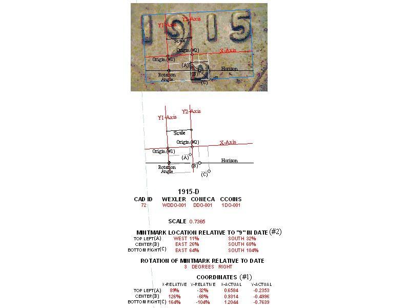 As some here know I have been using a CAD System for many years as a tool for attributing coin varieties. Mainly Lincoln Wheat Cents. During this time I have accumulated a significant amount of data covering an extensive number of varieties in the series. I am not seeking financial gain. I just want to share this information with the coin collecting community. But I do have some problems and questions concerning this data. Although I find this information personally useful – being it was created by me personally – I can not judge the data in an unbiased manner as being truly useful to the coin collecting community. I don’t want to spend a lot of time compiling and providing information people will not use. So maybe ya’ll can help me with this and give me your opinion. I created the data and therefore understand it easily but also realize that although it is based on a simple concept its presentation may be complicated and confusing to others. I want to provide the information in an easily understood format useful to coin collectors with or without a Cad System. I could use your input on this also. The basic concept is as follows. A landmark feature on the mintmark side of a coin is selected for each coin design. Using the precision of a CAD System the location of the mintmark relative to this landmark feature is established and recorded for each die variety. Attached is an image of a Lincoln Cent 1915-D WDDO-001 containing all the CAD construction as an example. The Following is an explanation of the construction of an image imported in my CAD System. The (Y1) axis is established by drawing a line down the edge of the "1" in the date. All construction is draw parallel or perpendicular to this axis except for the Horizon line and the mintmark diagonal. The (Y2) axis is established by drawing a parallel line to the (Y1) axis along the inside most edge of the "9" in the date. The (X) axis is established by drawing a perpendicular line to the (Y1) axis at the lowest point of the "9" in the date. Where this line intersects the (Y1) axis and the (Y2) axis creates Origin 1 and Origin 2. The mintmark is boxed in with lines parallel and perpendicular to the (X) or (Y) axis running through the northern most, eastern most, southern most and western most points of the mintmark. The intersections of these lines create point (A) and point (C). A diagonal line is drawn in the mintmark box connecting point (A) and point (C). Point (B) is established at the midpoint of this diagonal line. The scale equals the distance from origin 1 to origin 2 as measured using the precision of a CAD System. Which equals the width of the "9" in the date. The scale value equals 100%. Using point (C) as an example. The actual distance of the scale in this image is 0.7365 inches. The actual (X) value of point (C) based on origin 1 is 1.2044. (1.2044/0.7365) = 1.6353 or approximately 164% of the scale. From this point forward it doesn’t matter what size image is utilized. The length of the scale may be different but for the Lincoln Cent 1915-D WDDO-001 the (X) coordinate for point (C) based on origin 1 will 164% of the width of the mintmark. And the (Y) coordinate will always 104% of the width of the mintmark. These relative coordinates can be expressed in many different ways computed from many different origins. Take point (A) as an example. Based on origin 2 it is 11% of the width of the mintmark West of the origin which is the same as a (X) coordinate of –11%. With a (Y) coordinate 32% South or –32%. The Horizon Line is created by orienting the image based on the mintmark being straight in the CAD workspace. A line parallel to the workspace itself is drawn. The angle where this Horizon line intersects the (Y) axis is measured using the precision of the CAD tools. On the example provided this angle measured at 93 degrees or as indicated 3-degree rotation to the right. Any angle greater than 90 degrees indicates a mintmark rotation to the right. Any angle less than 90 degrees indicates a mintmark rotation to the left. Anyway as you can see this information can be presented in a plethora of different ways, I just need to know if the coin collecting community would find it useful and if so in what form would it be easiest for people to use. Not only is this information useful in variety collecting – it also can be utilized in counterfeit detecting. The 1909-S VDB was struck by only 4 dies – each with their own unique mintmark location.
