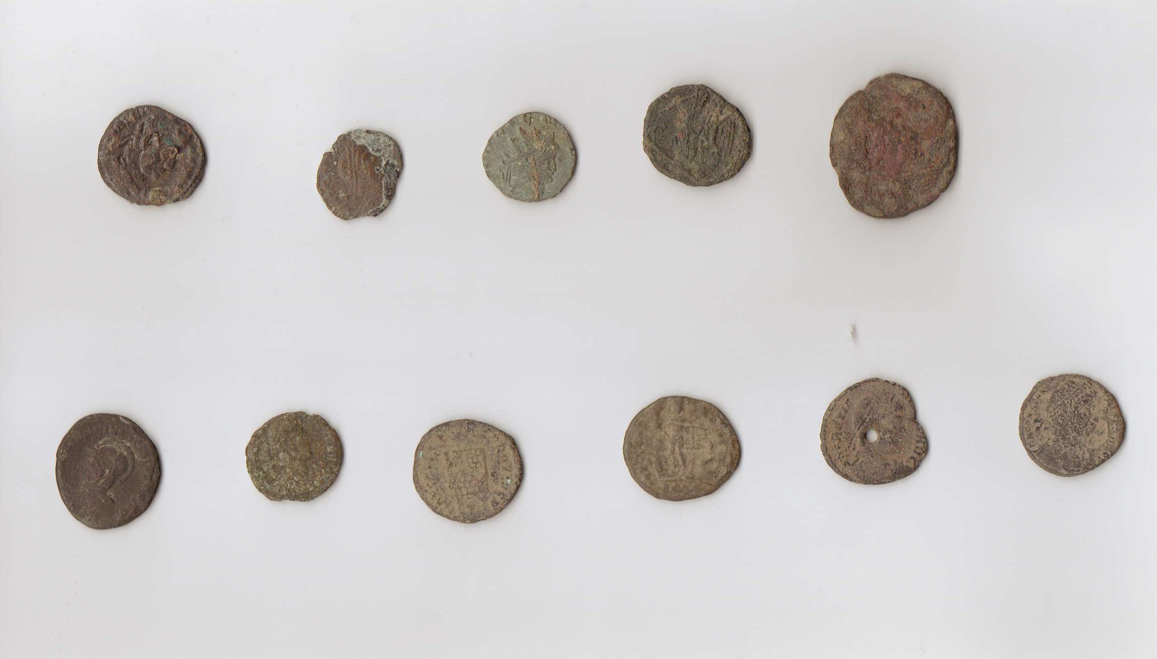 Top middle: my guess is Gallienus; to its immediate right is a Constantinople commemorative by Constantine the Great; lower left: Licinius II but all these are just best guesses from poor photos. If you want better ID's we need clearer and both sides. Most are ragged enough that it is unlikely that we will read mintmarks and the ruler is not a certainty for all even if the coins are in hand. On the bottom row is a victory steering emperor in boat which is usually Constans but can be Constantius II and a campgate which will be some member of the Constantine or Licinius families but we need the other side.