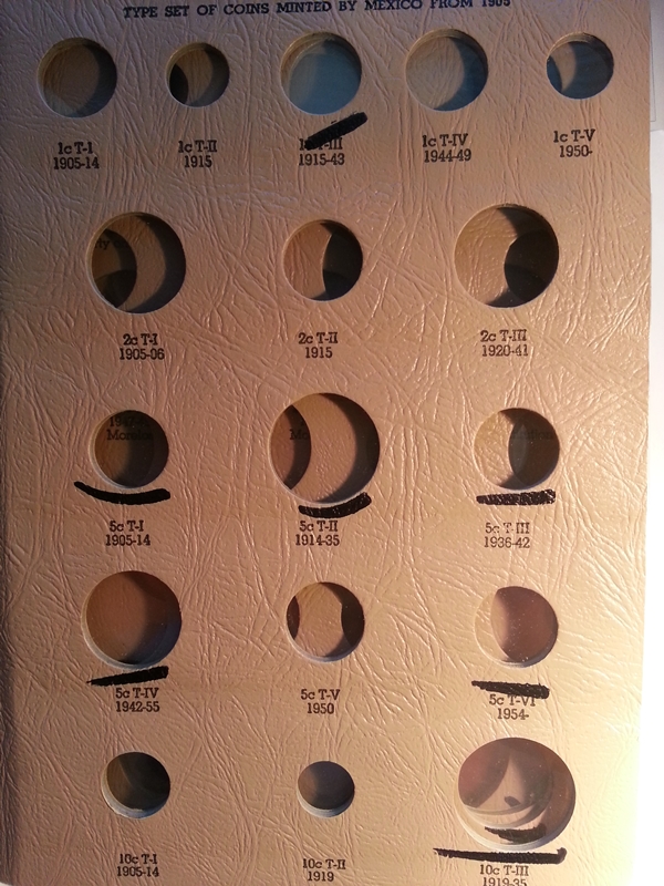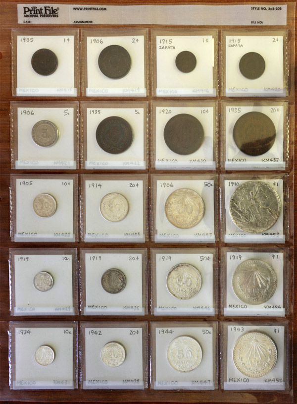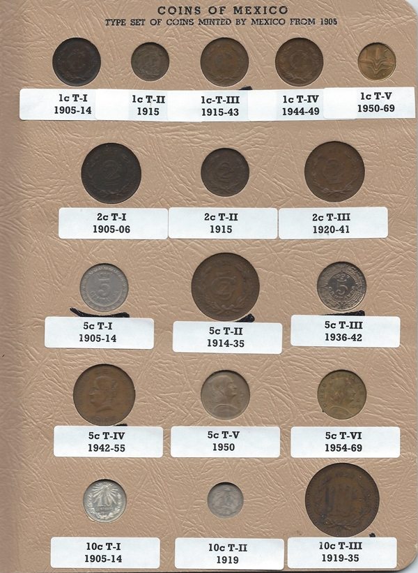 This isn't nearly as elegant as sonlarson's solution, but here's the first page of a 20th century Mexico type set done in a binder page. I like to group things together more by time period than by denomination, though doing this logically can be a challenge. And there are disadvantages to this method - for one thing the glare on the sheet makes a decent photo impossible. It's also given me a neurotic tendency to collect things that come in sets of 20 ; )