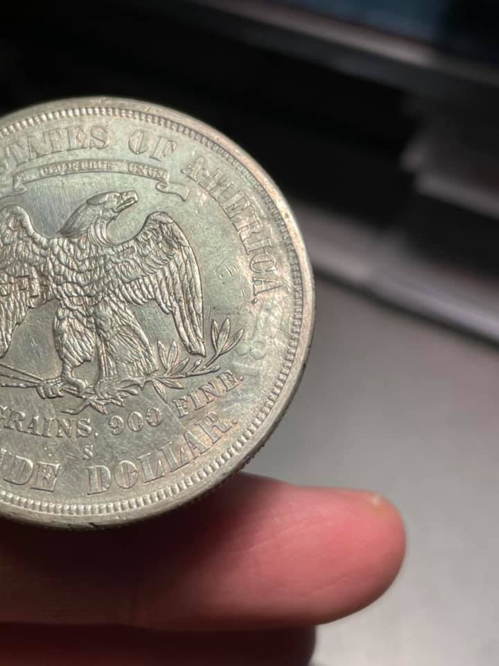 A friend is questioning this one. Stated "aside from the coin having some issues, there’s faint lettering of TRADE DOLLAR on the obverse and stars on the reverse. The coin weighs right and tests correctly on the Sigma. Is this a counterfeit? Or an error? Re-struck dollars? Die clashes? I also have a 1875-S and 1877-S with a very similar look". Images of the 1875-S added for reference.