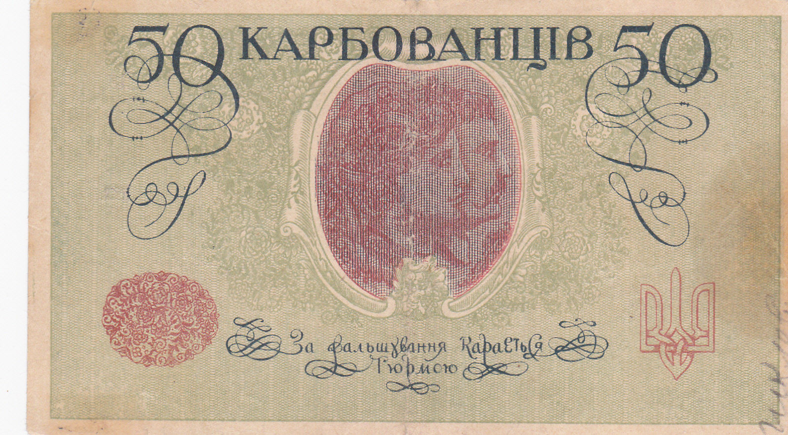 I'm no expert on Ukrainian banknotes, but the cheap paper looks right for the time. Also, the seller sells tons of banknotes from regimes that collapsed at low prices. Basically, everything makes sense to me that this would be a legitimate note. The reason why a hundred year old banknote would be so cheap is that the Soviets won the war, so these notes were worth essentially nothing by 1920. Looking a bit further, this article from Wikipedia tells a bit about General Denikin who sort of split off from other Ukrainian national groups fighting against the Soviets: http://en.wikipedia.org/wiki/Ukrainian_karbovanets "After occupation of Odessa by military units of Denikin's Army in spring, 1919, the printing house of Odessa continued printing bank-notes of 50 karbovanets. The Ukrainian Government was indignant and proclaimed money issued by the Denikinists to be false (series AO, numbers 210 and above)."