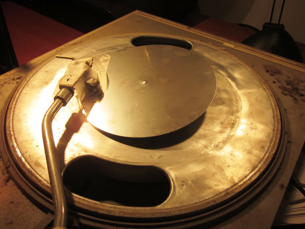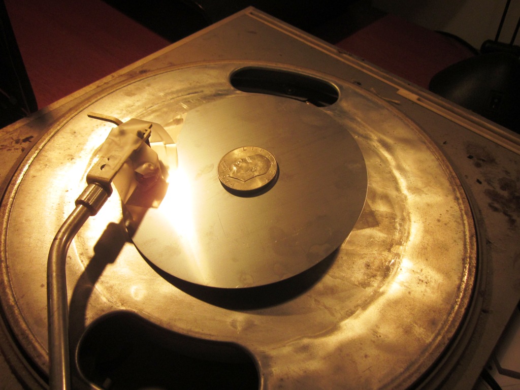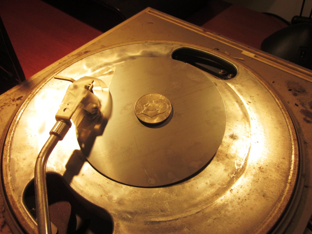 Here is a description of the set-up. First the rubber pad was removed from the turntable exposing the aluminum turntable beneath. A metal disc (scrap from my factory) was then dented at the center so that it fit onto the center post of the turntable. The metal disc is securely taped to the tone arm. (See photo #1). This taping to the tone arm keeps the disc from rotating while the turntable beneath does rotate. A ball bearing was attached to the tone arm just to weight it heavily. A similar ball bearing was taped to the turntable beneath. As the ball bearing taped to the turntable rotates, it caused the metal plate to rise (where the ball bearing is located). (See photos #2 & #3). The result is that the plate rocks & rolls while it does not rotate.