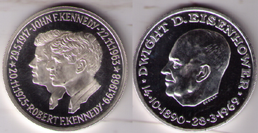 Among a collection of coins left to me 16 years ago by my grandfather are these two medals (?). Sorry for the quality; my first uploads. One is Eisenhower with his birth and death dates. The other is JFK and RFK with birth and death dates for each. The reverse eagle is the same for both, except the Eisenhower is better defined, more like a proof. I don't know weights. Diameter is 34mm. Thickness is about 1mm. Edge is grooved, if that's the right word. I found this link to an ebay sale for the Ike, but nothing on the Kennedy brothers medal. http://cgi.ebay.com/ws/eBayISAPI.dll?ViewItem&item=360196882103&ssPageName=STRK:MEWAX:IT Indeed, the Ike is signed by Bodlak, but I find no signature on the Kennedys. They feel a little light to be silver. Help me out. What are they? What are they made of? What are they worth?