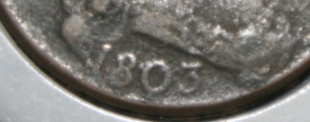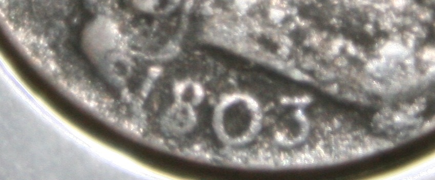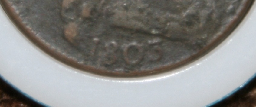 Hi. Here are some larger photos of the 1803 cent. I am using a Canon Digital Rebel XT with a Canon 18-55mm EFS lens. I am new to SLRs, so as for now I have the camera set to "Full Auto". I need to experiment with the aperture settings, etc., to take better macros. All in good time. Thanks everyone. Jonathan
