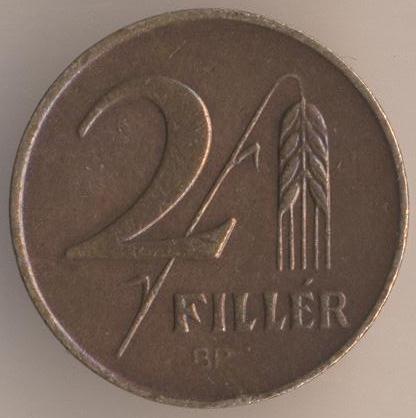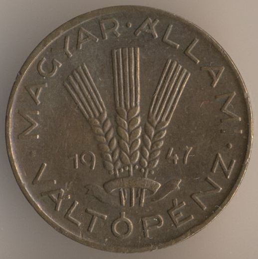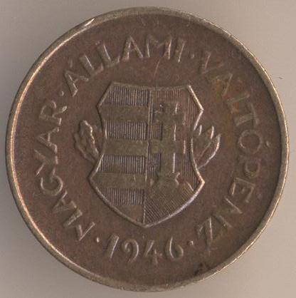 2 filler 1946, bronze, weight - 3 g., size - 17 mm, thickness - 1,7 mm, mintage - 13665000 pcs. Engraver: Ivan Istvan. Budapest Mint. Coins of this type were released at 1946 and 1947. Demonetized at June 30 1977.