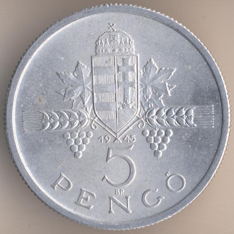 5 pengo 1945, aluminium, weight - 4,5 g., size - 32 mm, thickness - 2,58 mm, mintage - 5002000 pcs. Budapest Mint. Single release only. Provisional Government issue.