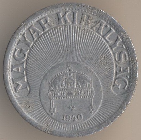 10 filler 1940, iron, weight - 3 g., size - 20 mm, thickness - 1,4 mm, mintage - 45926665 pcs. Engraver: Janos Palinkas. Coins of this type were released at 1940-42. Demonetized at December 31 1945.