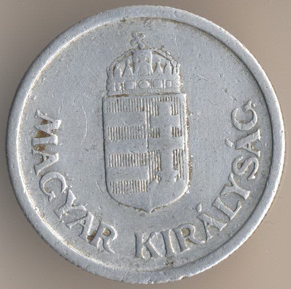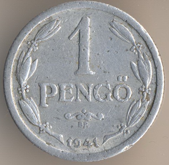 1 pengo 1941, aluminium, weight - 1,5 g., size - 23,7 mm, thickness - 1,6 mm, mintage - 80000000 pcs. Engraver: Lajos Beran. Coins of this type were released at 1941-44. Demonetized at December 31 1945.