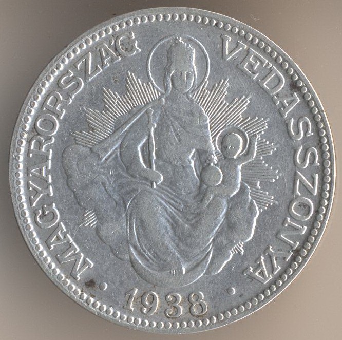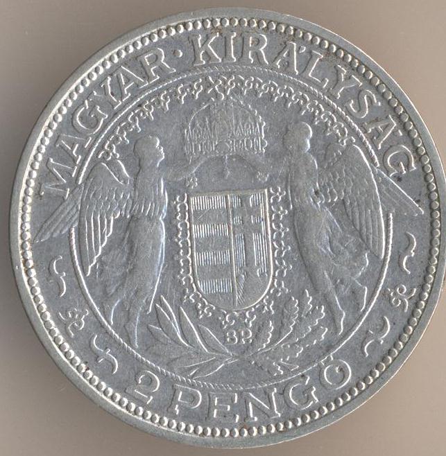 2 pengo 1938, silver .640, weight - 10 g., size - 27 mm, thickness - 2,1 mm, mintage - 6417000 pcs. Engravers: Istvan Szentgyorgyi (obverse) & Vince Pittner (reverse). Coins of this type were released at 1929, 1931-33 and 1935-39. Demonetized at January 31 1942.