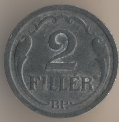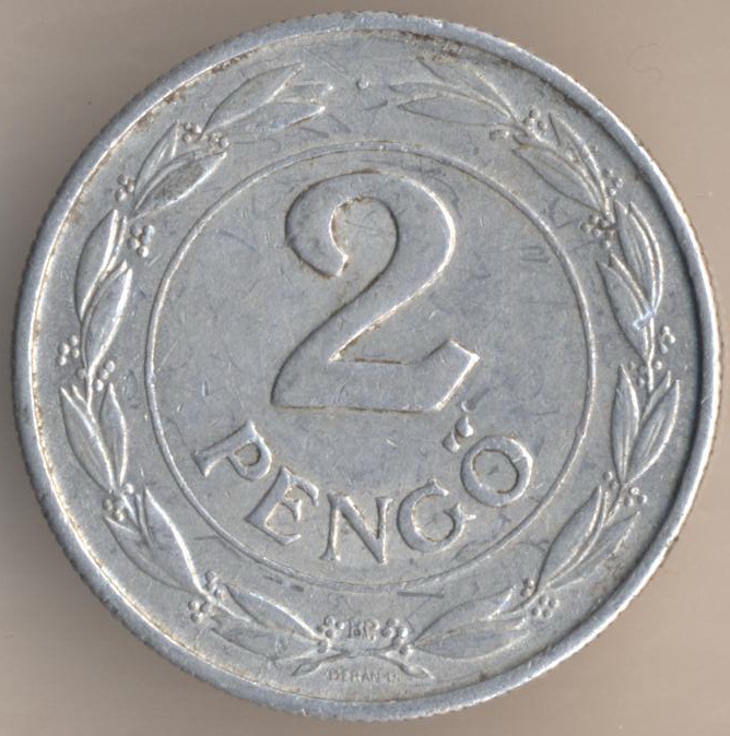 2 pengo 1941, aluminium, weight - 2,8 g., size - 28 mm, thickness - 2,2 mm, mintage - 24000000 pcs. Coins of this type were released at 1941-43. Demonetized at December 31 1945.