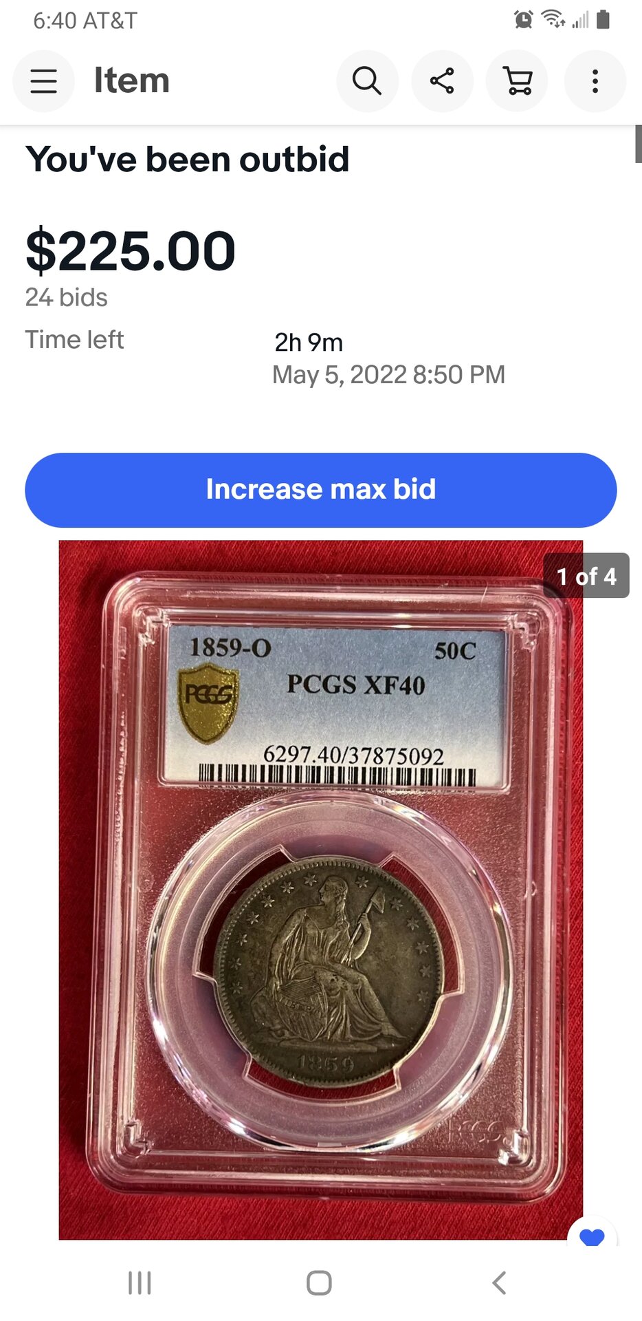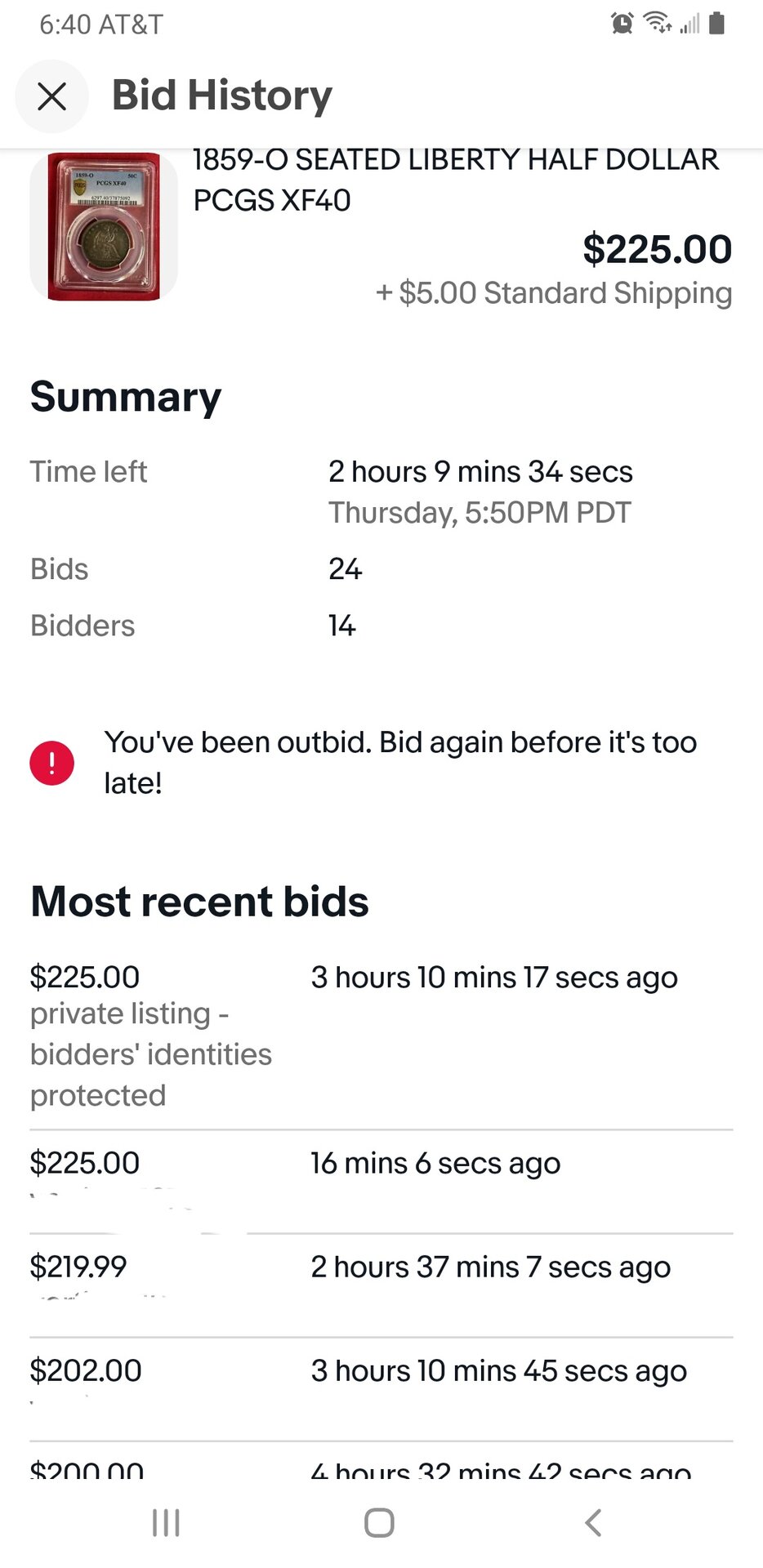It's like this one ending tonight, it got up there so I wanted to make sure this guy paid his top bid. This is why you don't get all crazy before the end of the auction guys. You do that you end up paying. Price guide is 225. I'm going to go to bed now and let this guy pay 225.00+5.00 shipping. I didn't want to end with the 219.99 bid. I wanted to push him to the tie. Now if there's a sniper waiting, they will pay even more. This is a very nice half. Comes with truview. You want a premium coin you're going to pay on the bay