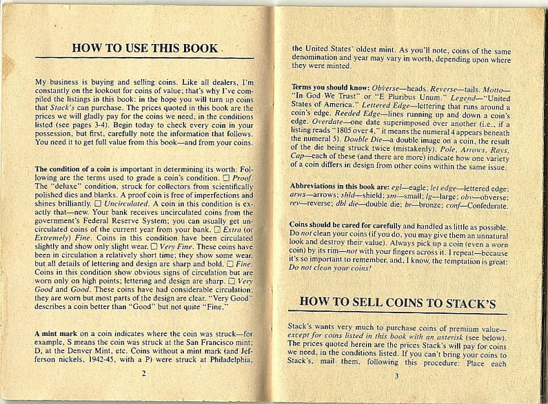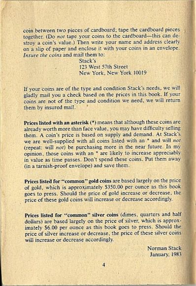 1983 Stacks Coin Buying Guide Here are some selections from the 1983 version of this book. I think it's a great contrast to 1971 since gold was at approximately $350/oz according to the book at the time of printing (late '82 I think). First I'll post the introduction that explains their process, grading, etc: