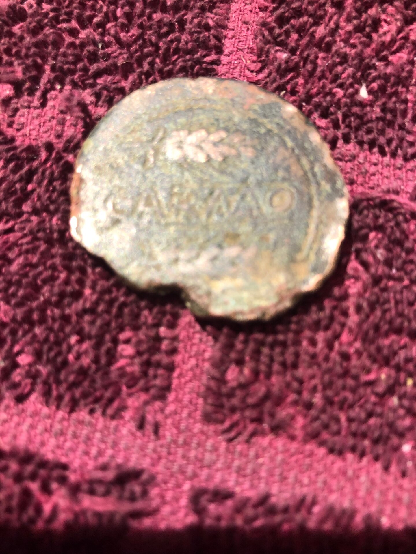 I am not kidding, I literally found this "lump" in the trash next to the coin machine at my credit union can along with a small pile of other foreign coins a bit more than a year ago: It is an early Roman era coin from Carmo in what is now Spain, was minted ca. 200 BC. After I found it it took a couple of days to identify it - mainly the legend on the reverse and the sheaf of wheat.