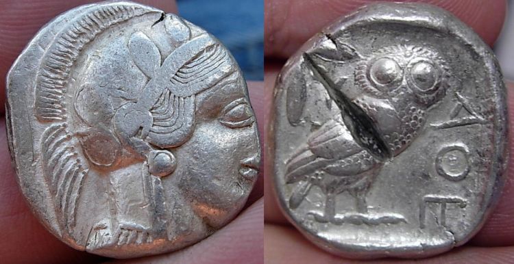 It's an effect of aging : you get owl Sure, they are pricey, but as a lucky man with a loving wife, I've been gifted with an owl earlier this year (related thread here : https://www.cointalk.com/threads/between-my-wife-and-i-an-owl-story.280813/#post-2461578 ) Owl standing right, head facing, olive sprig and crescent behind, all within incuse square. ΑΘΕ in the right field 24mm, 17.08 g, 8h Ref : Kroll # 8; HGC # 4,1597 Q